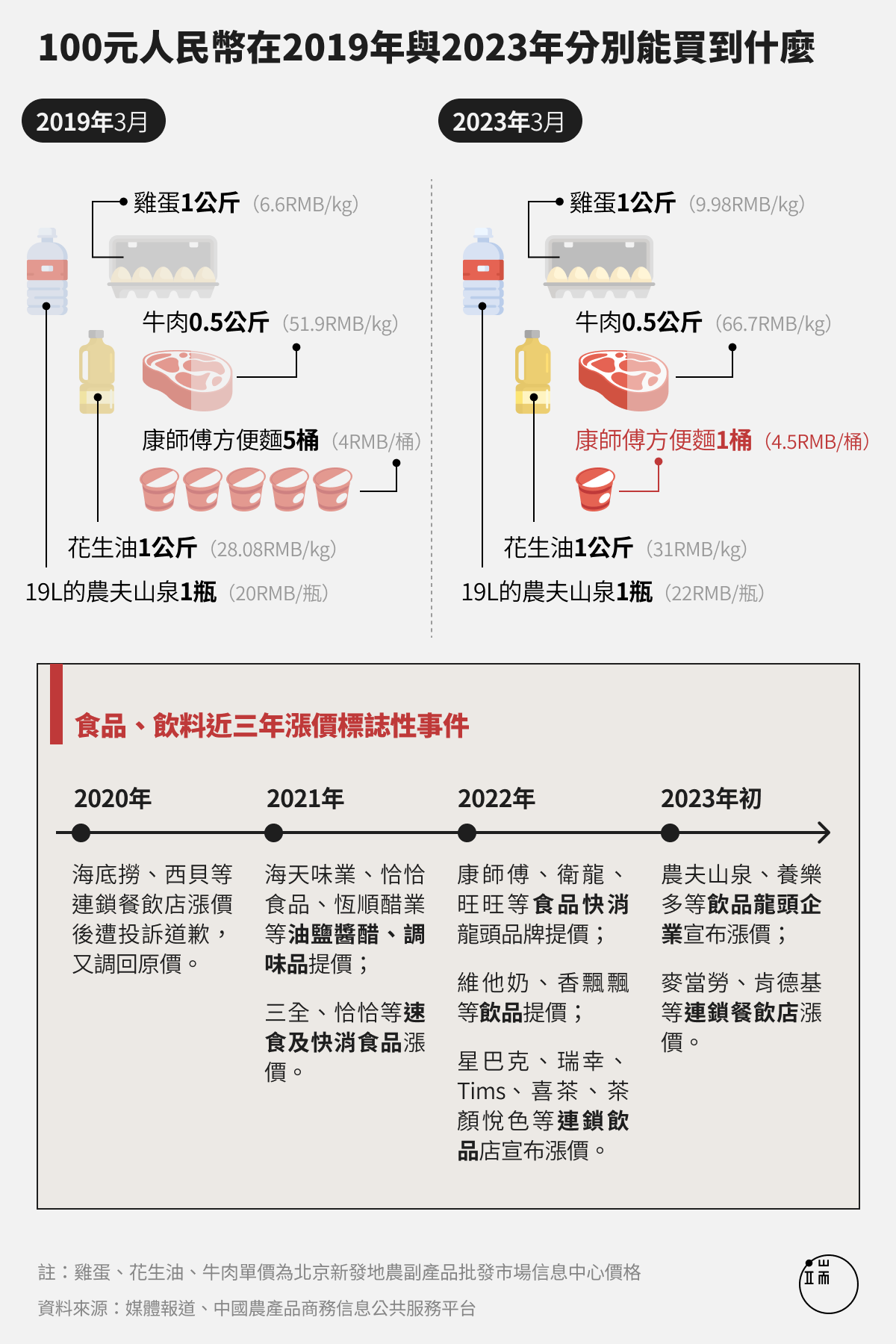 2023年2月初,有武漢市民發現早餐店的熱乾麵整體漲了0.5至1元,成了6元一份,當地餐飲協會會長回應指是「市場調節行為」,原因一是春節前上調了員工工資,二是上游原材料價格上漲。熱乾麵並非特例,疫情過後,餐飲漲價的信息便浮現於高漲的消費者價格指數(CPI)、接連不斷的品牌商提價新聞、與網民出行後在社交媒體的感嘆裏。