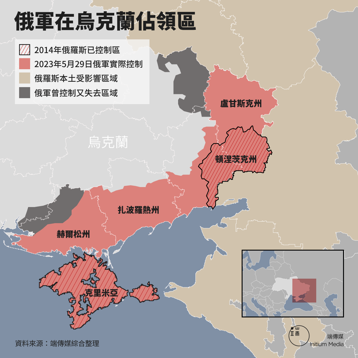 俄烏戰爭的戰況並非一面倒,戰線持續拉鋸,自俄羅斯瓦格納僱傭軍(Wagner Group)宣稱,於2023年5月20日攻陷俄烏兩軍爭奪已久的巴赫姆特(Bakhmut)後,俄羅斯佔領的烏克蘭領土約10萬平方公里;實際上,俄羅斯在去年5月之際,曾一度控制16萬平方公里的烏克蘭領土。經過長達15個月的交戰,俄軍所佔領的烏國領土持續丟失。