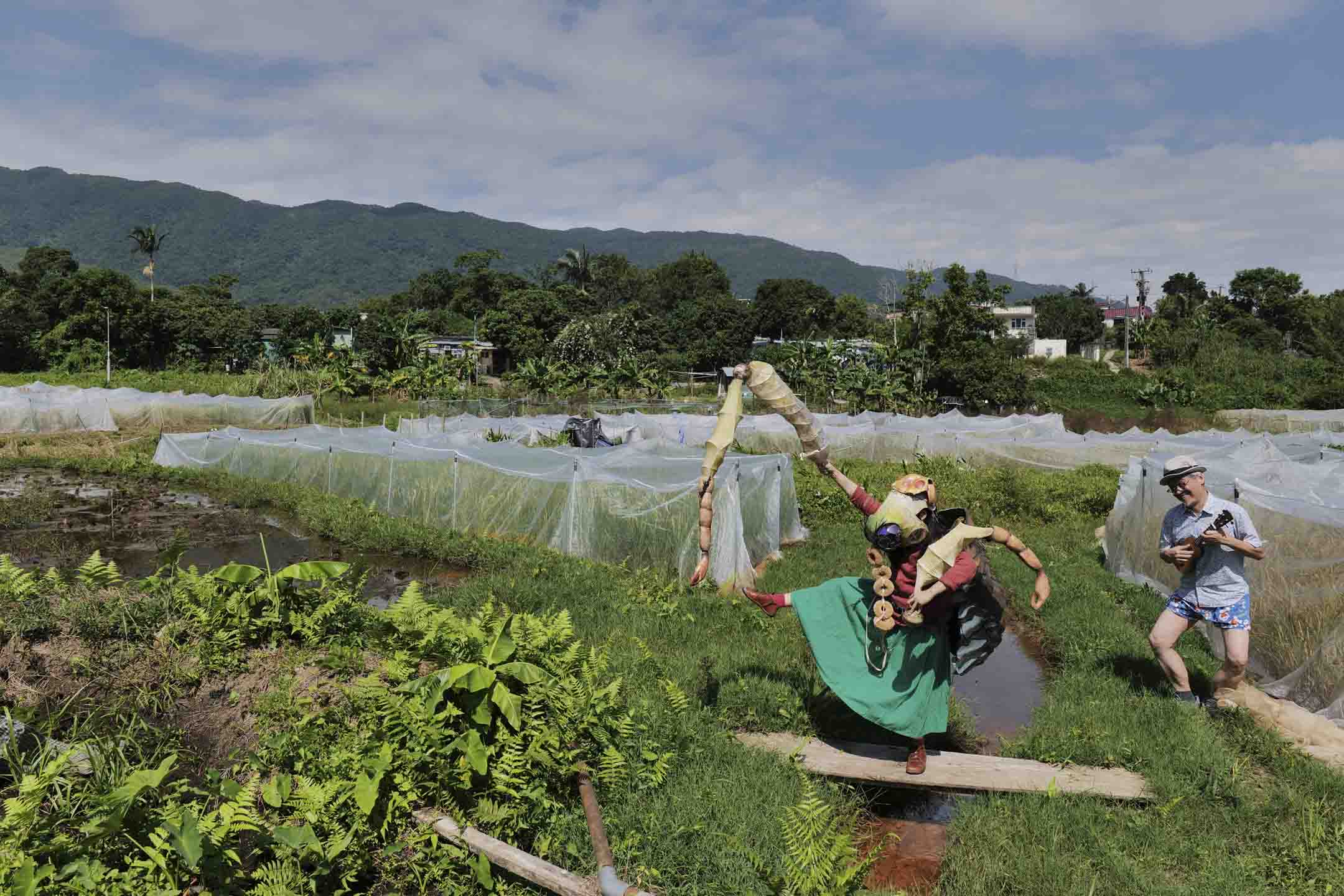 照片是源自2022年疫情下的一个计划⸺“新冠新观”的“下回分解”联展。概念来自卡 夫卡的《变形记》的一句:“早上起床发觉自己变成虫。”疫情突然降临,我们的身份亦 顿时产生变化,我邀请数位朋友穿戴虫的道具后拍摄及访问,像是超现实的特摄片。人 物是小咪(也是制作虫的道具的戏偶师)和她丈夫 WF CHAN,地点是大埔。