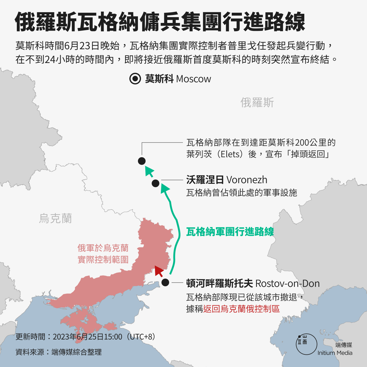 25日凌晨,已前進至莫斯科州,距離首都莫斯科市不足200公里的瓦格納大軍,突然收到領導人普里戈任的命令,停止前進並開始撤軍,理由是透過白俄羅斯總統盧卡申科(Alexander Lukashenko)的調解,並經俄羅斯總統普京(Vladimir Putin)同意,雙方已經達成協議。