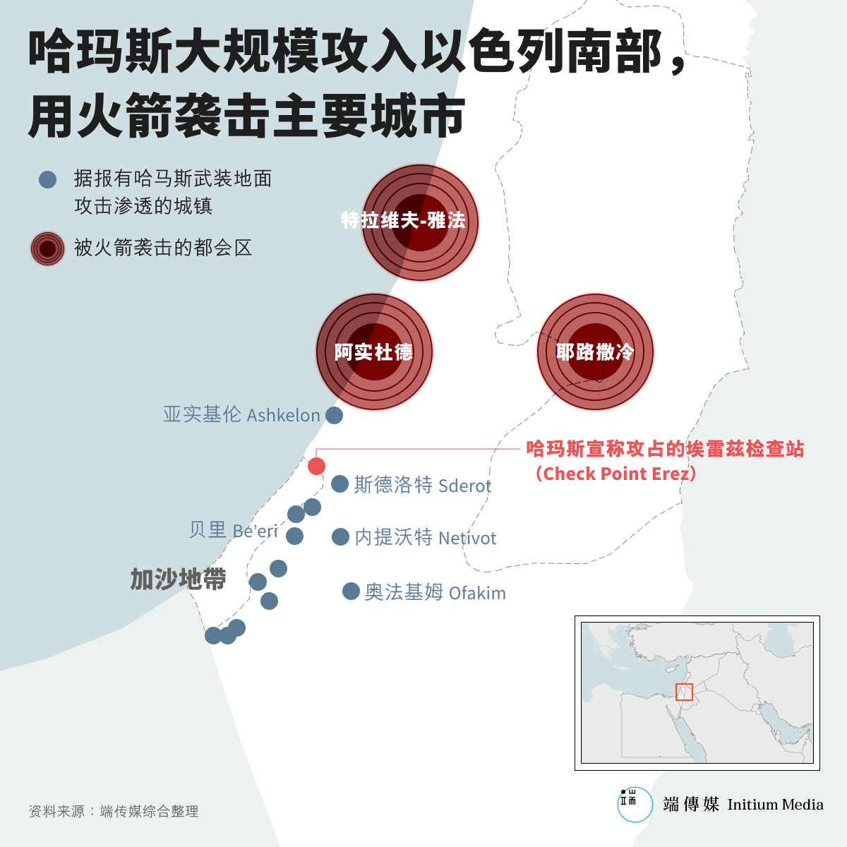 10月7日当地时间清晨6时半开始,控制加沙地区的巴勒斯坦武装组织哈马斯(Hamas)突然向以色列境内大量发射火箭弹,并以地面推进和特殊作战渗透,攻入以色列南部和加沙接壤的多个城市。这是多年来以色列停火线境内受到的最大规模、伤亡最重的攻击。(延伸阅读:《以巴冲突升级:石头、实弹、无主之地》)