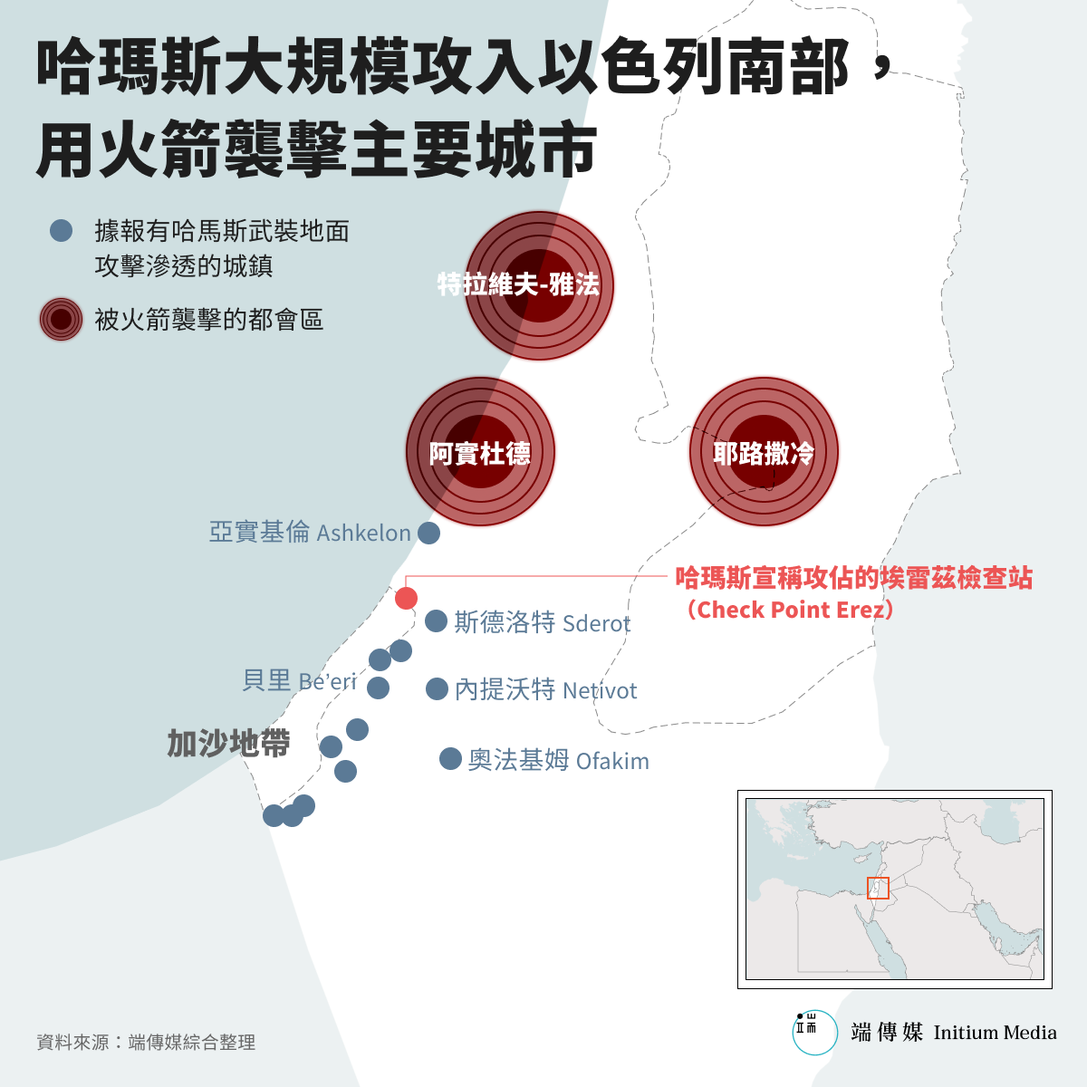 10月7日當地時間清晨6時半開始,控制加沙(台譯:加薩)地區的巴勒斯坦武裝組織哈馬斯(Hamas)突然向以色列境內大量發射火箭彈,並以地面推進和特殊作戰滲透,攻入以色列南部和加沙接壤的多個城市。這是多年來以色列停火線境內受到的最大規模、傷亡最重的攻擊。(延伸閱讀:《以巴衝突升級:石頭、實彈、無主之地》)