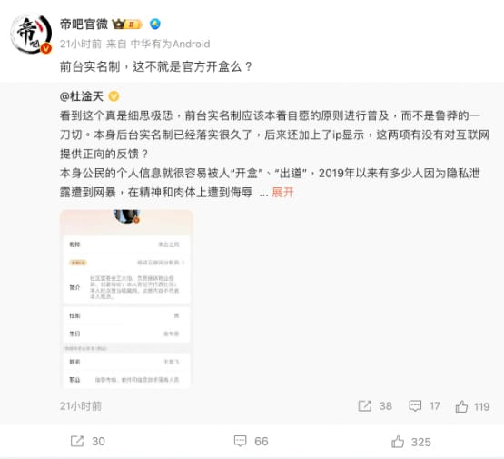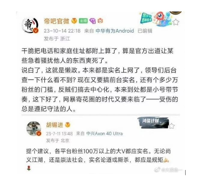 值得一提的是,不少“爱国大V”本次也对前台实名制提出异议。拥有161万微博粉丝、曾多次引导中国网友前往海外平台“出征”的@帝吧官微,罕见发文批判,称该规定实为“懒政”,表示“受伤的总是遵纪守法的人”。