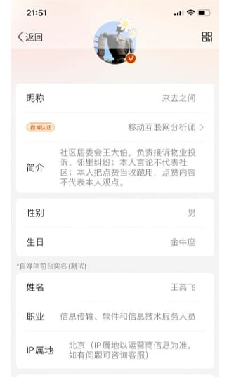 10月19日晚,有微博用户发现,@来去之间 本人微博帐号已显示“自媒体前台实名(测试)”结果,显示结果包括其真实姓名王高飞,职业则标注为“信息传输、软件和信息技术服务人员”。