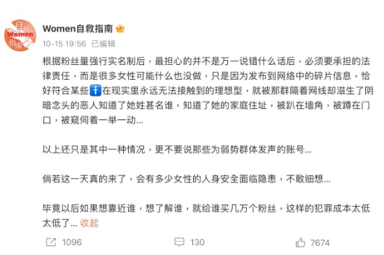 微博简介为“非营利性质全女性互助联盟”的博主@Women自救指南则指前台实名制可能会给女性及为弱势群体发声的博主带来人身安全隐患。“很多女性可能什么也没做,就被那群隔着网线却滋生了阴暗念头的恶人知道了她姓甚名谁,知道了她的家庭住址,被趴在墙角,被蹲在门口,被窥伺着一举一动⋯⋯”