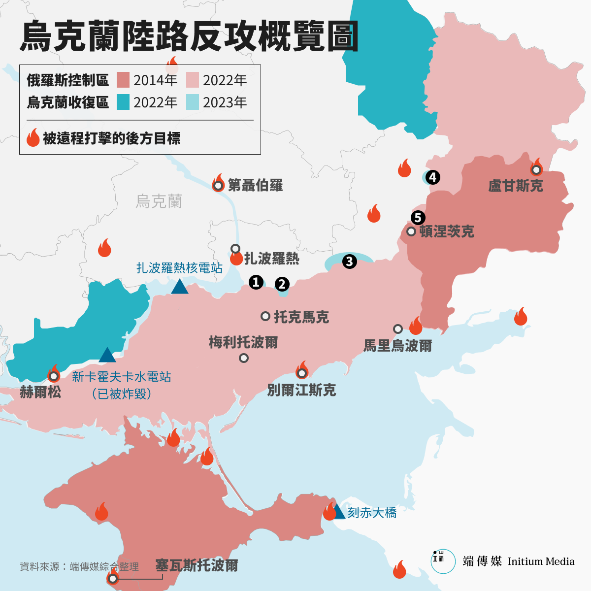 2022年末起,烏軍與瓦格納僱傭軍圍繞頓巴斯城市巴赫穆特(小圖4)展開了俄烏全面戰爭打響以來最為血腥的攻防戰。2023年5月,俄方完全控制巴赫穆特城區。為爭奪這座已不具重大戰略意義的城市,雙方按照較高的估計恐怕有十萬人陣亡。元氣大傷的瓦格納軍在攻下城市後逐漸撤出,烏軍則在南北兩翼發起反攻,奪回了城南兩座要塞化村莊,但距離切斷城市補給,迫使俄軍撤退的目標尚十分遙遠。
