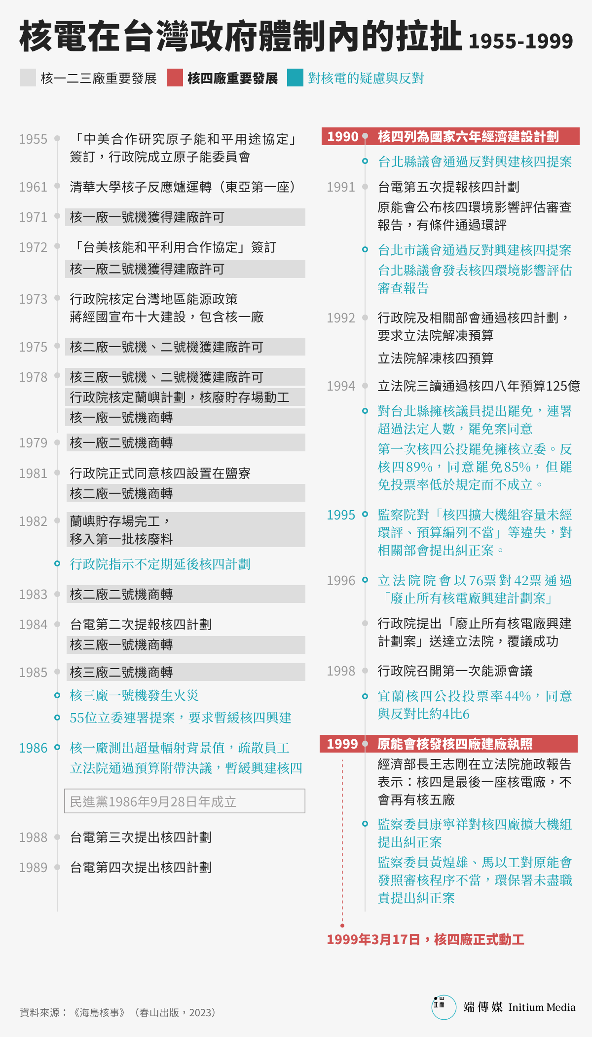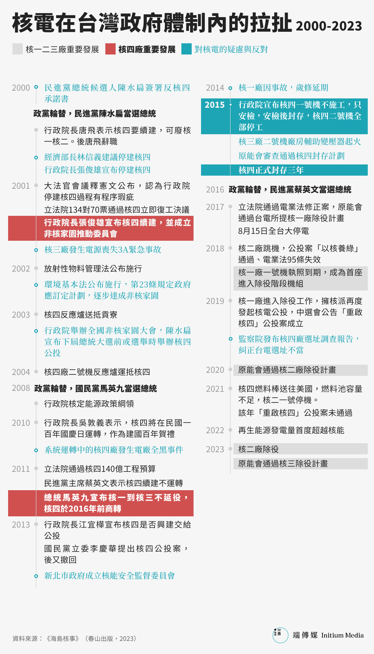 直至2023年10月,核電僅提供全台灣6%的電力需要,來源是唯一還在運轉中的核三廠。而這個唯一座落在南部屏東的核電廠,隨著一號機組與二號機組即將在2024年、2025年屆滿40年之期,進入除役程序。換句話說,除非政治介入,否則在2025年,台灣土地上將不會有任何一座核電機組運轉。