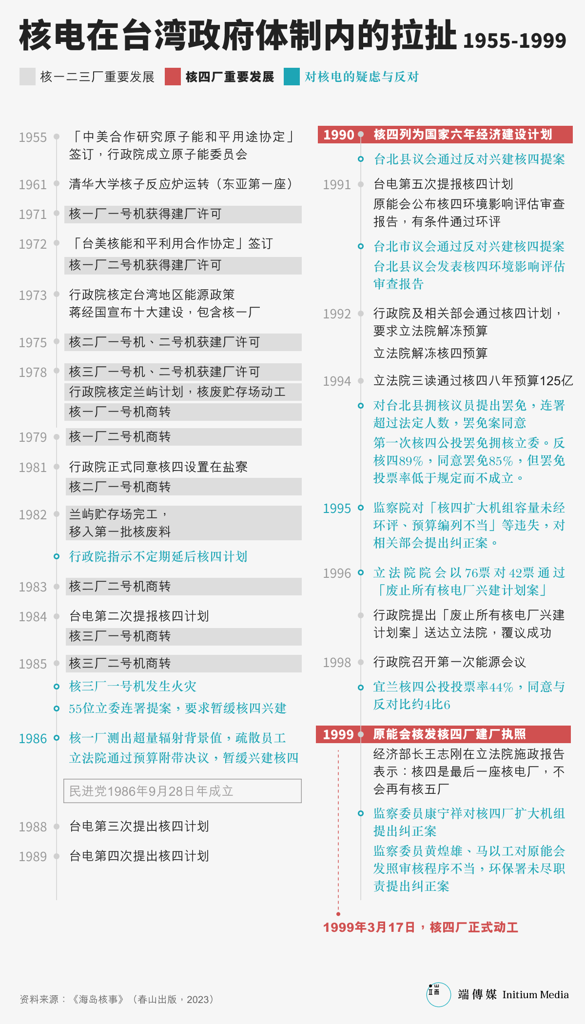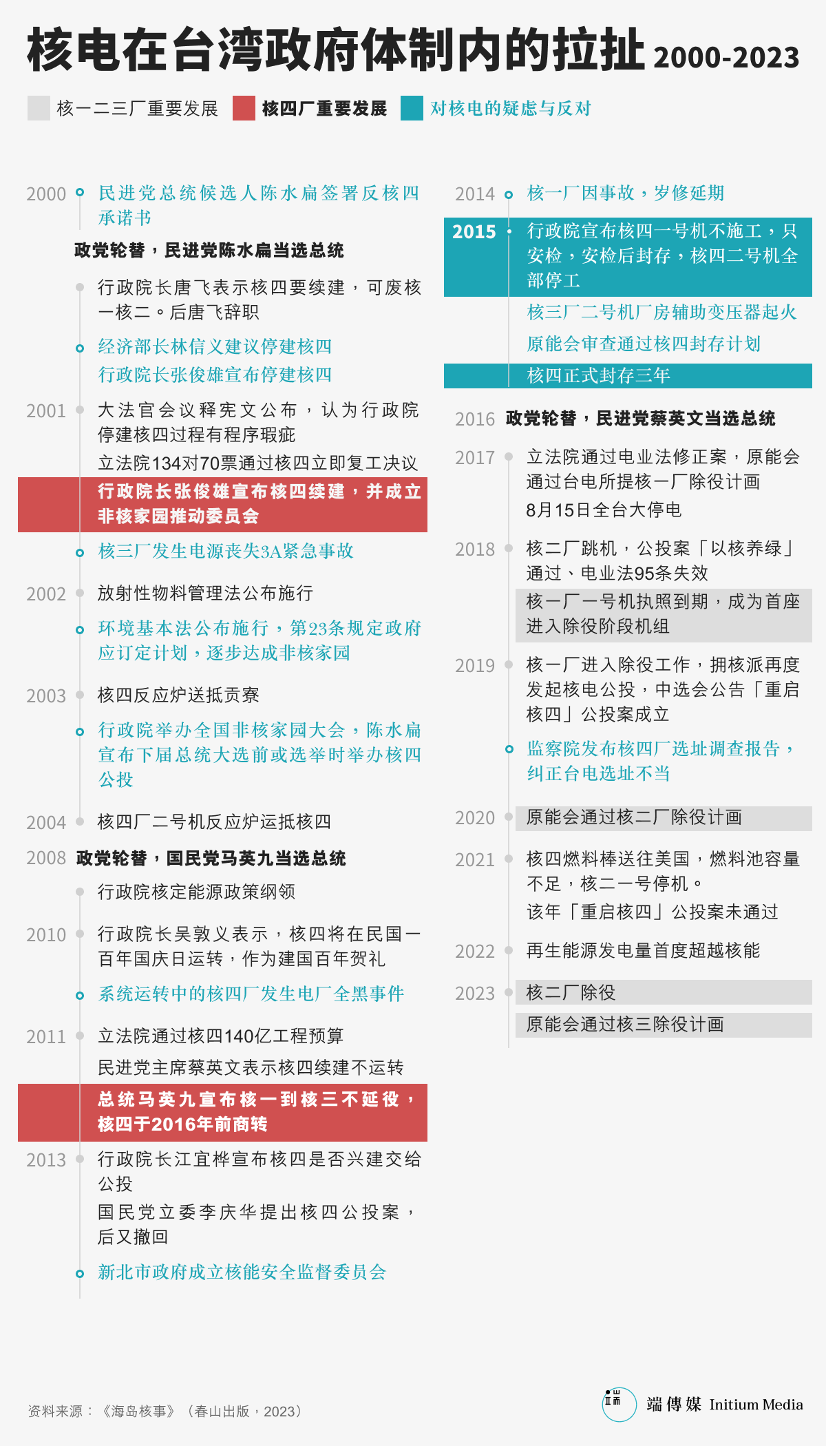 直至2023年10月,核电仅提供全台湾6%的电力需要,来源是唯一还在运转中的核三厂。而这个唯一座落在南部屏东的核电厂,随著一号机组与二号机组即将在2024年、2025年届满40年之期,进入除役程序。换句话说,除非政治介入,否则在2025年,台湾土地上将不会有任何一座核电机组运转。