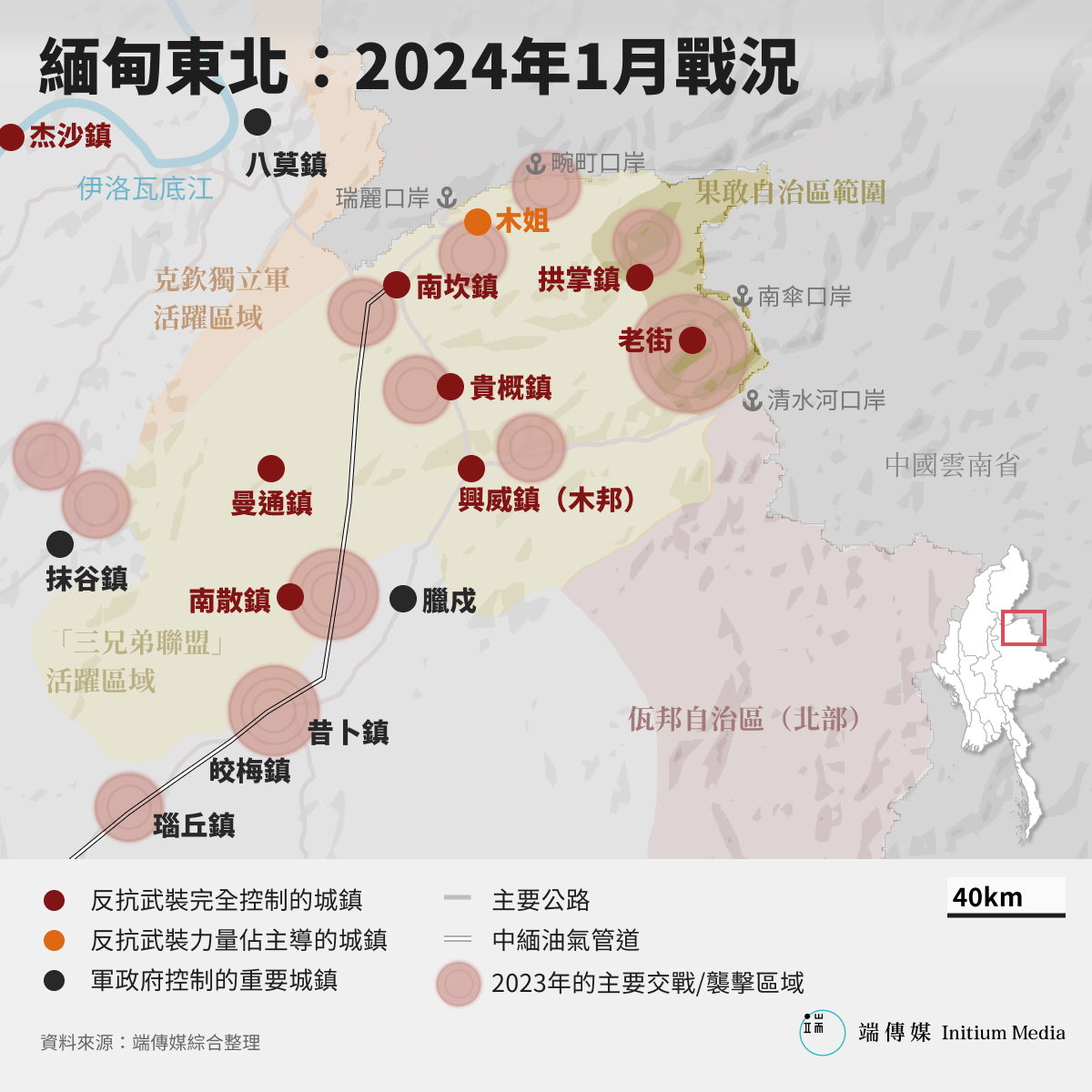 另據抵抗武裝1月9日的通報,在撣邦北部的戰鬥中,他們還完全控制了貴概和興威兩個鎮區。這使得緬甸東北的抵抗武裝控制區已經連成一片,目前仍為軍政府所控制的中緬邊境木姐城區已經成為「孤島」。