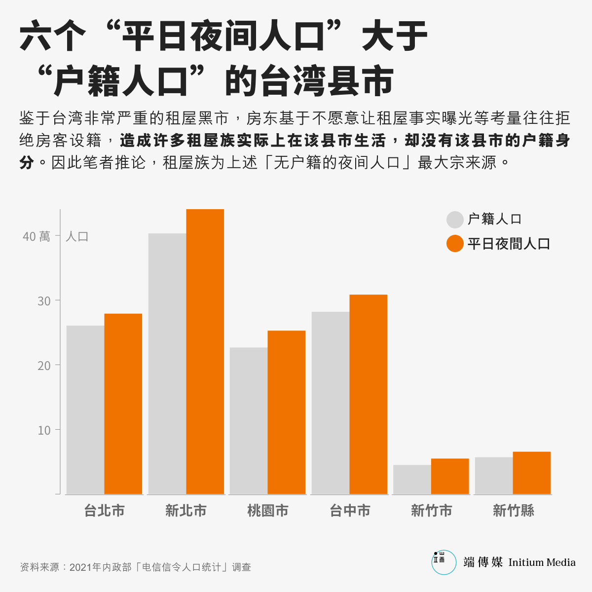 这些“于该地区无户籍的夜间人口”的民众是谁?情形可能颇为复杂,电信信令调查无法对此细致辨别。然鉴于台湾有著非常严重的租屋黑市,房东基于不愿意让租屋事实曝光等考量往往拒绝房客设籍,造成许多租屋族实际上在该县市生活,却没有该县市的户籍身分。因此,笔者合理推论,租屋族为上述“无户籍的夜间人口”最大宗来源。
