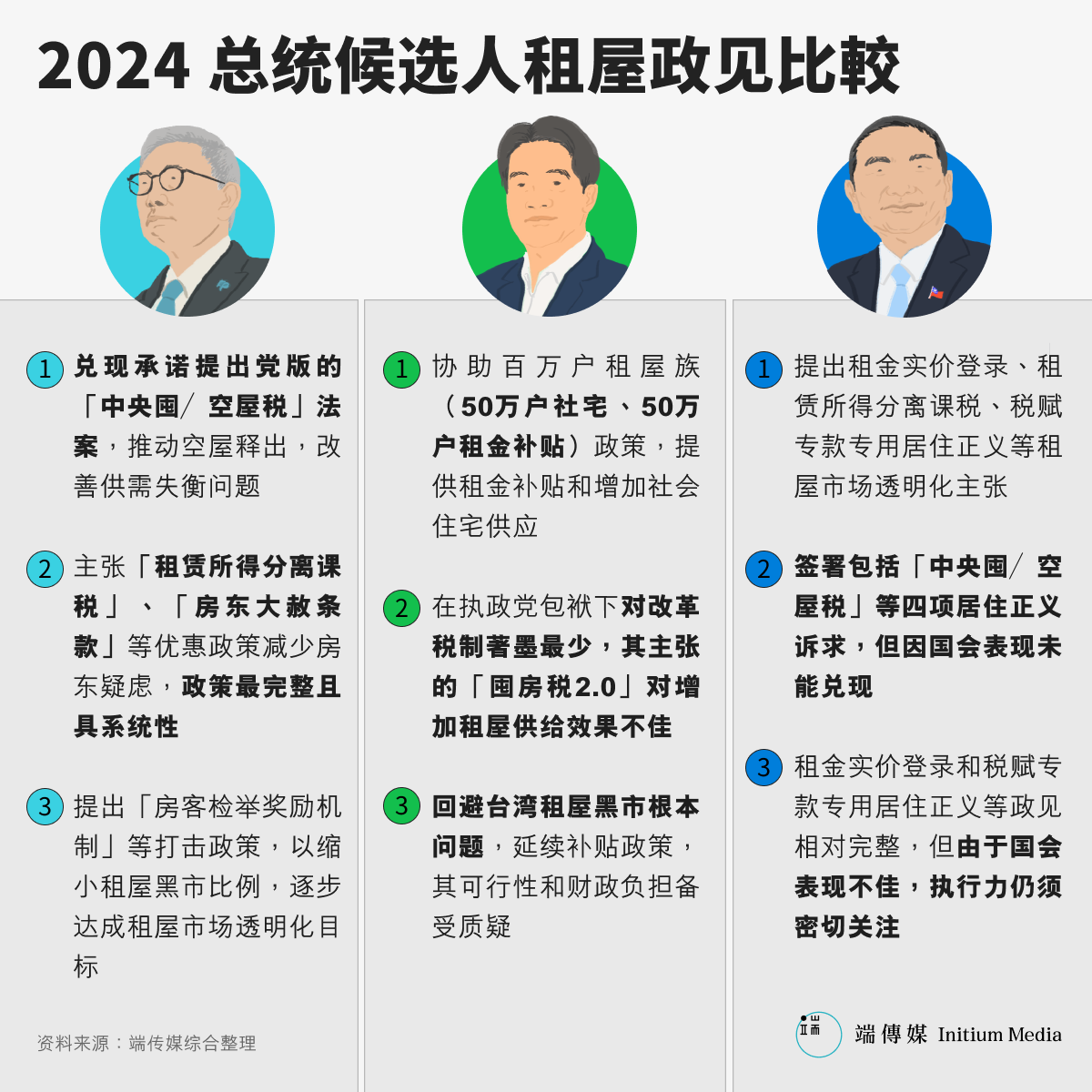 赖清德推动百万租屋族政策,但在税改上著墨较少;侯友宜签署居住正义诉求但国会未能兑现;柯文哲提出相关法案,推动空屋释出,改善房屋供需。