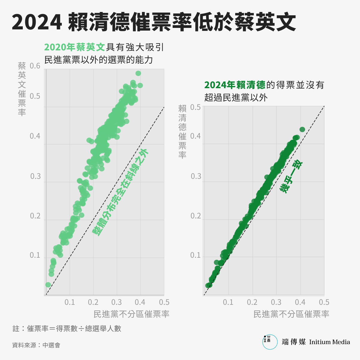 然而,一旦我們比較2020年蔡英文與民進黨不分區、以及2024年賴清德與民進黨不分區的得票結果,可以看到巨大的差別:在右圖中,賴清德2024年在全台368個鄉鎮的催票率(得票數除以總選舉人數),跟民進黨2024年不分區的催票率幾乎是一致的,整體分布非常接近1比1的斜線。換句話說,賴清德的得票並沒有超過民進黨以外,而許多泛綠本命區,例如賴清德擔任過市長的台南市,也沒有開出比民進黨得票更多的票。