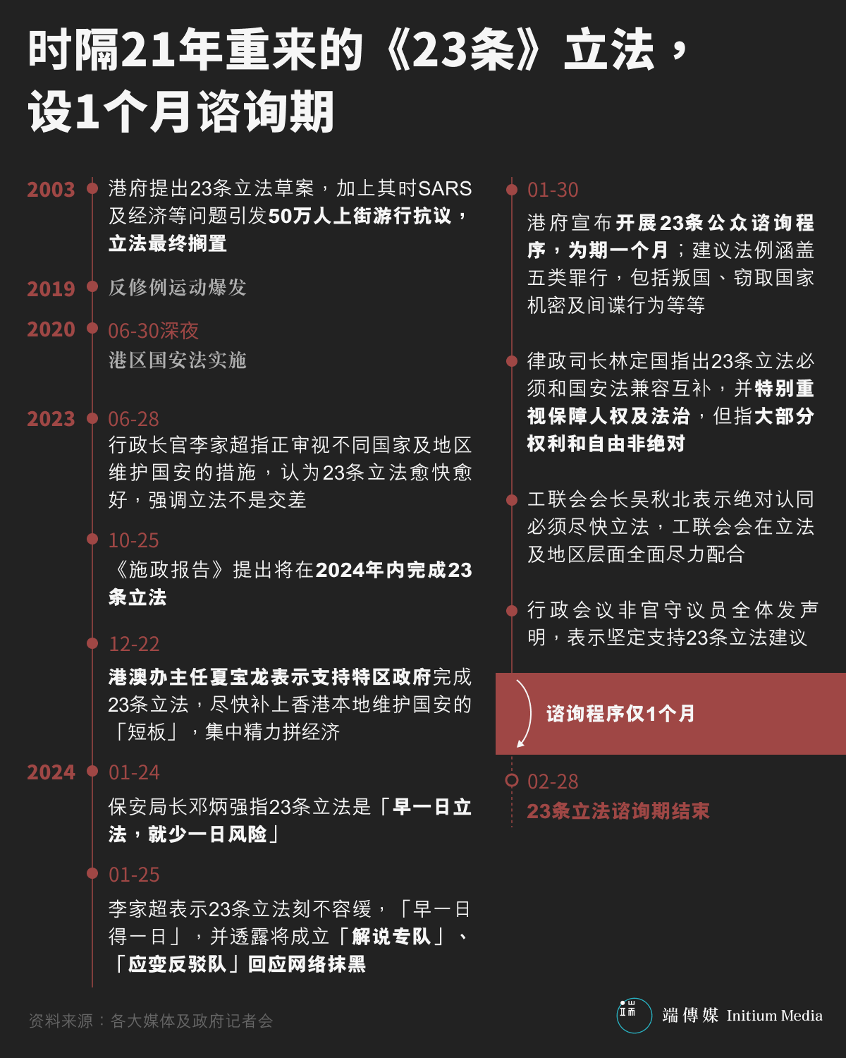 《国安法》落成后,完成23条立法便成为港府的“首要任务”。2023年10月25日,特首李家超在《施政报告》提出将在2024年内完成23条立法,两个月后,港澳办主任夏宝龙亦在活动上表示支持特区政府。随后,李家超在多个场合亦表示立法“越早越好”、“刻不容缓”。