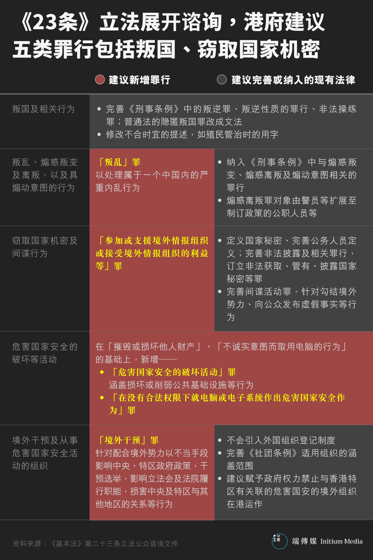 问一:港府提出《23条》立法建议咨询文件中的五大罪行是什么?港府建议修订哪些现有罪行,又建议新增哪些罪行?
