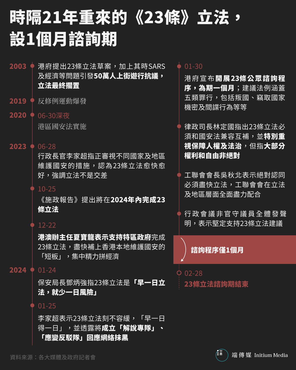 香港政府於1月30日宣布開展《基本法》23條立法的諮詢工作並釋出文件,建議完善不少現有法例,並新增罪行以處理國安法實施後的國家安全問題,諮詢為期一個月。新法的起草框架涵蓋五類罪行,包括叛國及相關行為,叛亂、煽惑叛變及離叛及煽動罪,竊取國家機密及間諜行為,危害國家安全的破壞等活動,以及境外干預及從事危害國家安全活動的組織等罪。