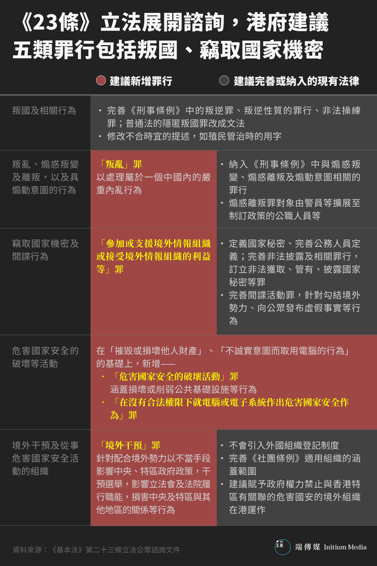 問一:港府提出《23條》立法建議諮詢文件中的五大罪行是什麼?港府建議修訂哪些現有罪行,又建議新增哪些罪行?