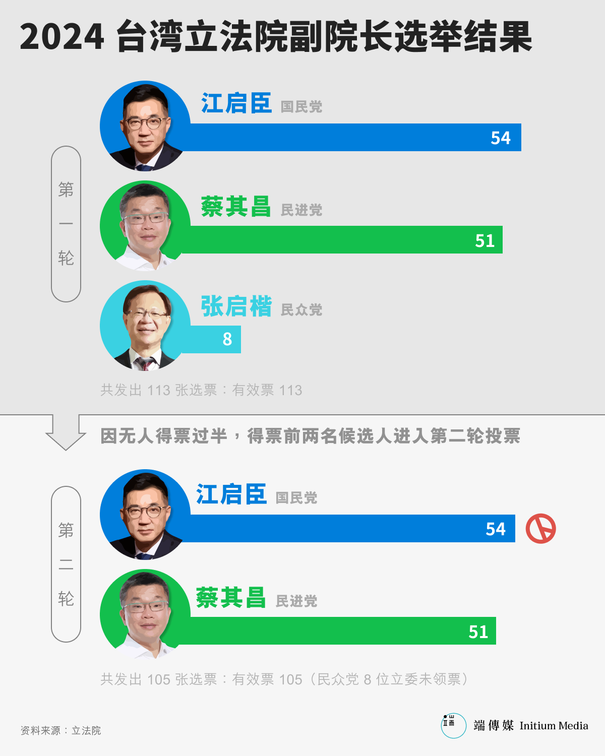 副院长选举于下午展开,在第一轮投票无人过半下,举行第二轮投票,国民党立委江启臣拿到54票、民进党立委蔡其昌51票,江启臣当选第11届立法院副院长。