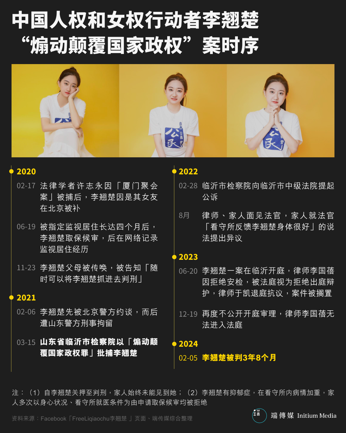 2月5日,中国人权和女权行动者李翘楚因“煽动颠覆国家政权”罪被山东省临沂市中级人民法院判处有期徒刑3年8个月,剥夺政治权利2年。
