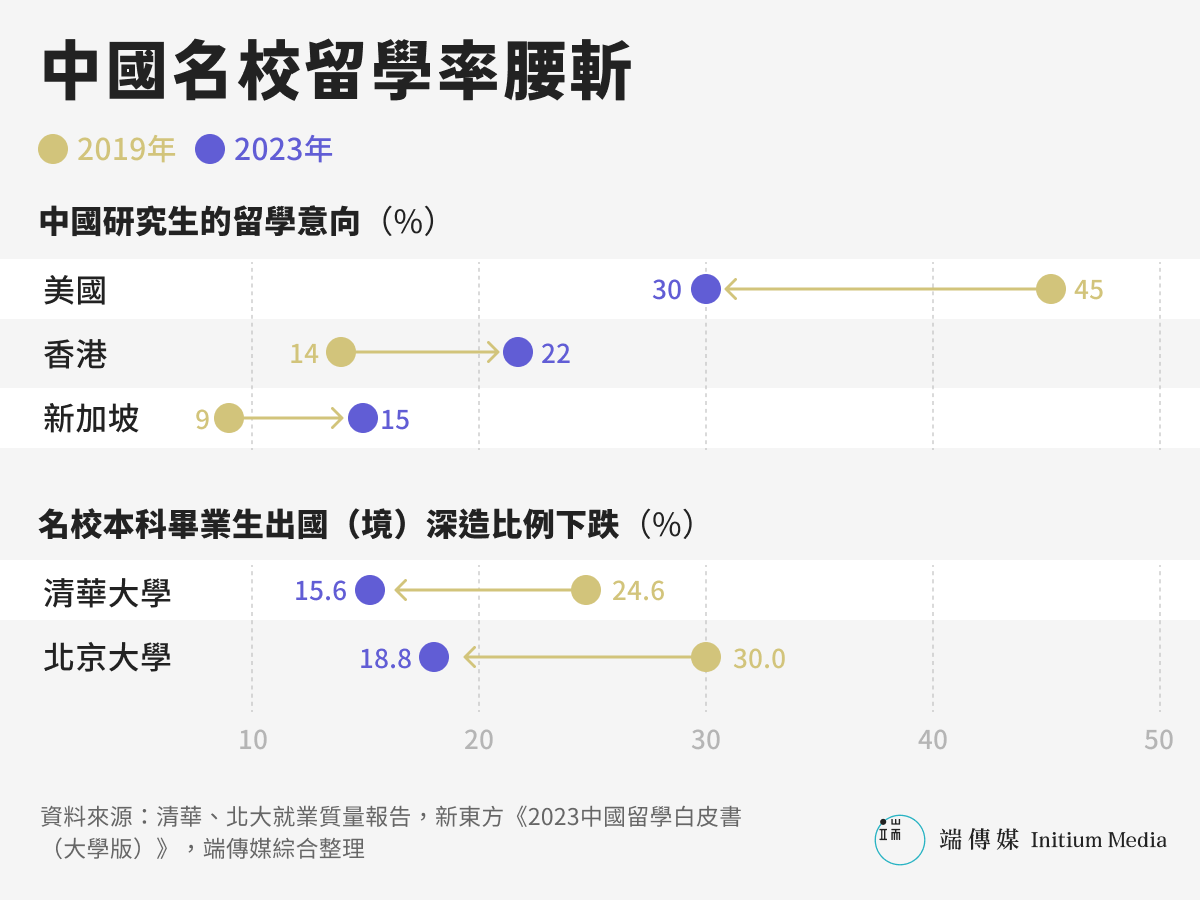 留學對大陸頂尖高校學生的吸引力似乎不再如往年。根據清華大學和北京大學2023年畢業生就業質量報告,與2019年前三年相比,兩校本科生出國率下降幅度接近4成。
