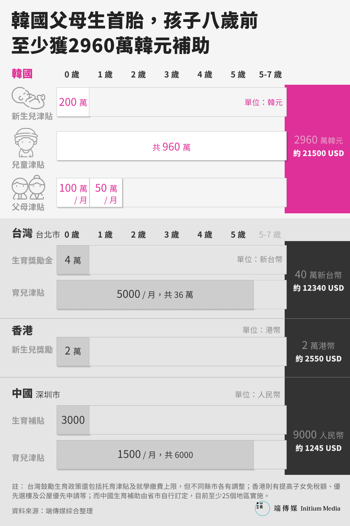 2023年,韓國生育率(fertility rate)跌剩0.72(指每名婦女終身生育的孩子數量),數字在全球包尾,也是韓國歷史新低。為了刺激生育,政府再提高補助金額,包括嬰兒出生第一年的父母津貼一共可以領到1800萬韓元,以及每月10萬、領到孩子七歲的兒童津貼。加上首胎新生兒一次性獲得的200萬韓元(約1450美元),一對新手父母在孩子滿七歲前,累計至少獲得2960萬韓元(約17萬港元)。