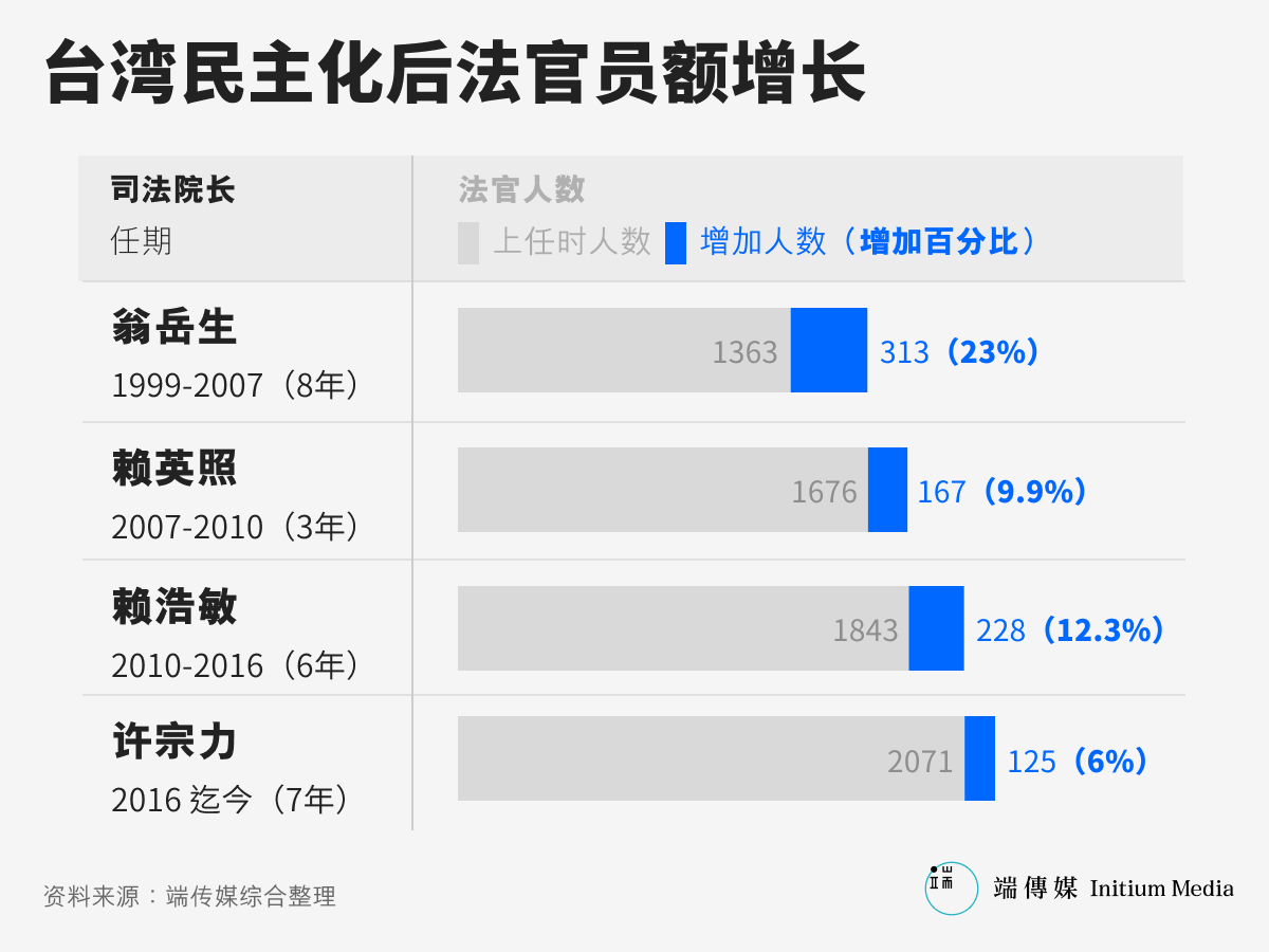 实际上,就员额问题来看,2016年蔡英文总统上任后,司改国是会议就提出放宽总员额规定。最终蔡政府任内已修正《中央政府机关总员额法》、《司法院组织法》,将本来员额限制从1万3900增加到1万5000人。不过,虽然增补员额帐面上看来增长1100人,但法官仅增加124人(其余尚有书记官337人、法官助理426人),其余则为辅助人力。
