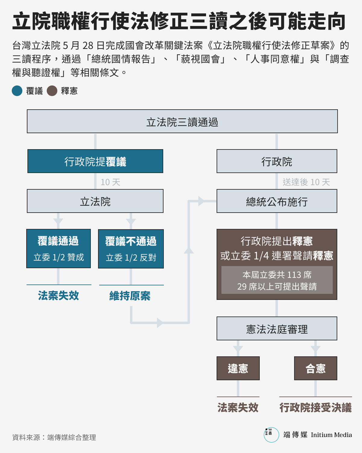 首先,以行政院覆議路徑來看,依據《憲法增修條文》第3條規定,行政院對於立法院決議之法律案認為窒礙難行時,法案送達10日內,總統可與行政院依法共同提起覆議,要求立法院重新投票,立院應在覆議案送達15日內作成決議,逾期未議決則失效。不過,1997年修憲後,立院重新投票的通過門檻已降為二分之一;換言之,如果有二分之一以上立委決議維持原案,行政院長應即接受該決議。
