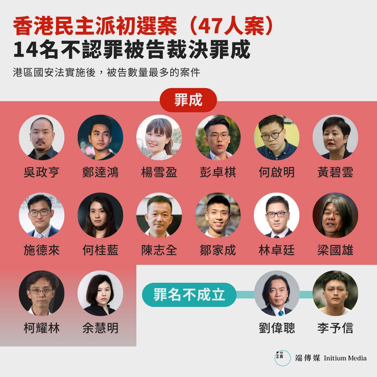 逮捕始自2021年1月6日的「香港民主派47人初選案」,審訊歷時118日,今日(5月30日)對16名不認罪被告作出裁決。早上約10時15分,法庭宣判劉偉聰、李予信罪名不成立,其餘被告「串謀顛覆國家政權」罪成。