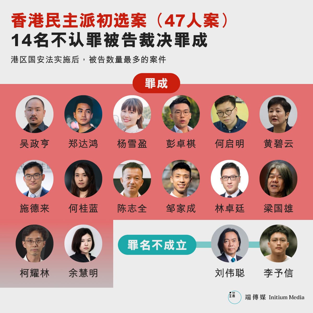 逮捕始自2021年1月6日的“香港民主派47人初选案”,审讯历时118日,今日(5月30日)对16名不认罪被告作出裁决。早上约10时15分,法庭宣判刘伟聪、李予信罪名不成立,其余被告“串谋颠覆国家政权”罪成。