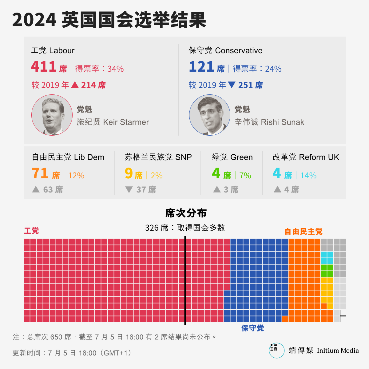 选前民调显示,苏纳克将可能成为有史以来第一个无法在选举中保住自己席次的首相。长远来看,在此前数年先后执政的保守党首相约翰逊(Boris Johnson)和特拉斯(Liz Truss,特拉斯)引发的一连串政坛风暴之后,民众对保守党的能力和操守都信心崩塌;加上长年的紧缩政策对公共服务带来的恶果逐渐浮现,对许多选民对保守党执政能力彻底不信任。出口民调显示,保守党可能仅能获得131席次,勉强保住官方反对党地位,创下1906年以来该党最差的选举成绩。