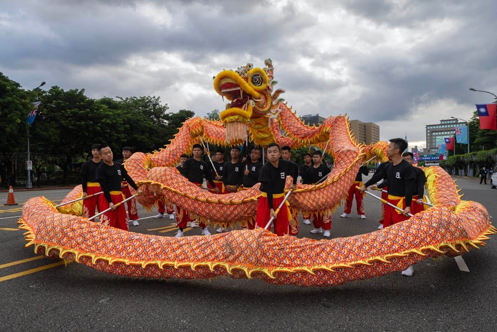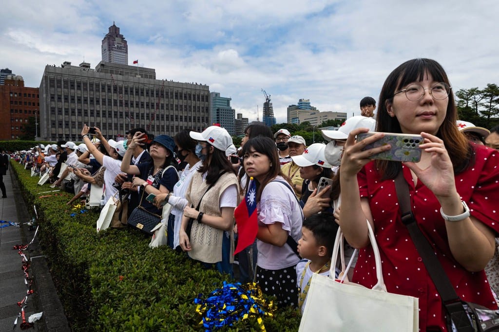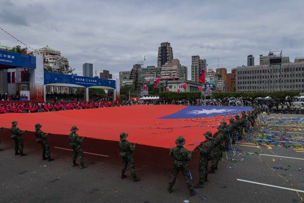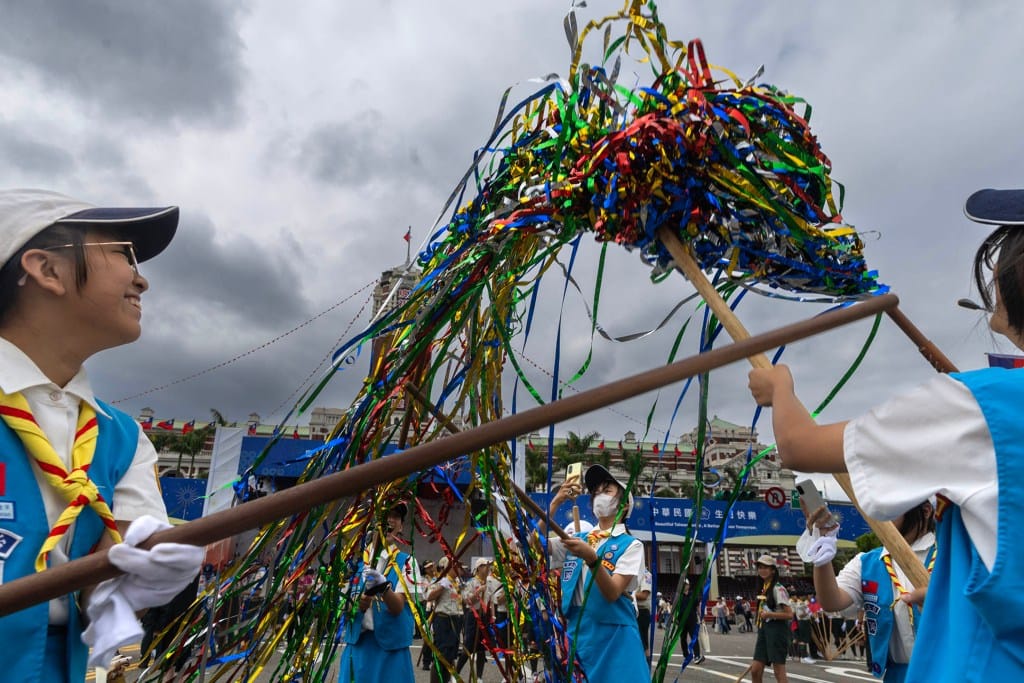 2024年10月10日,台湾总统府前广场,在前一个舞团的表演落幕后,于今年展开第一任期的总统赖清德在上午10时35分身着深色西装,左胸别上蓝红相间的“双十”徽章,走向讲台发表他的首次国庆演说。