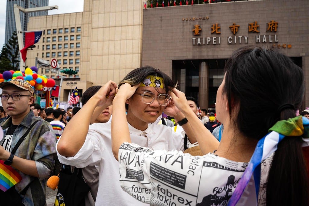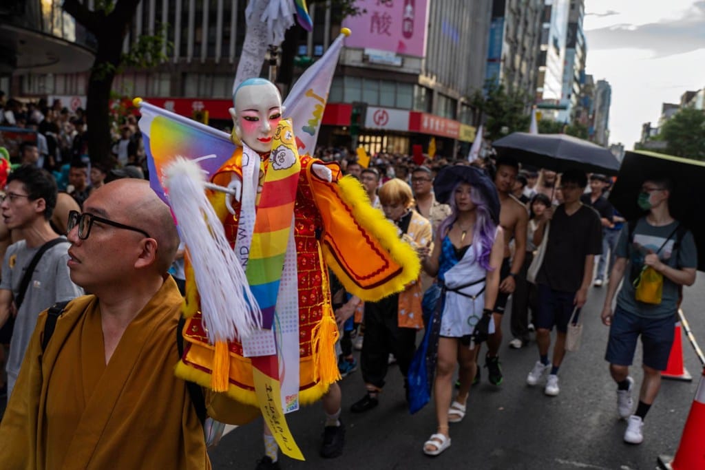 不少跨國籍同志伴侶相約參與遊行盛會,揮舞標語、旗幟,現場充滿超越文化語言的嘉年華氣氛。長長的遊行隊伍中,小民和小青輪流捧著披掛彩虹絲帶的媽祖神像,笑著說祂來台北作客一年了,待會遊行完終於要回南部。小民前一天才從屏東北上與小青會合,22歲的他過去都在高雄參與同志遊行,今年第一次來到台北現場:「我們有擲筊問媽祖可不可以一起遊行。」