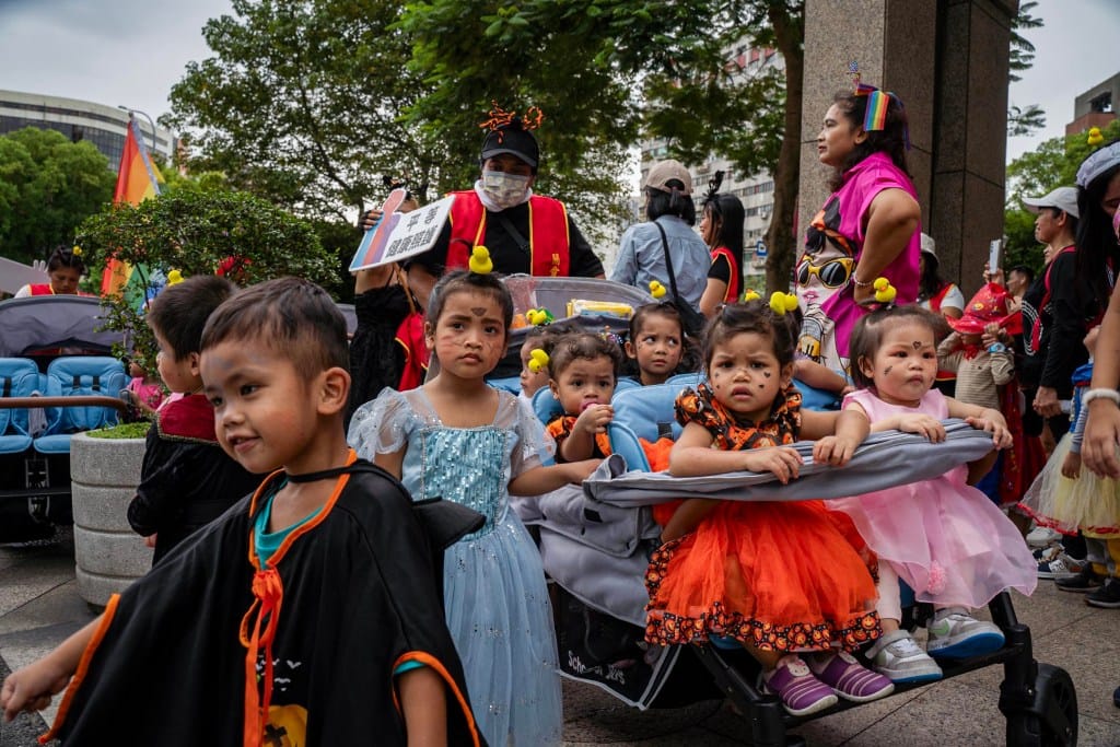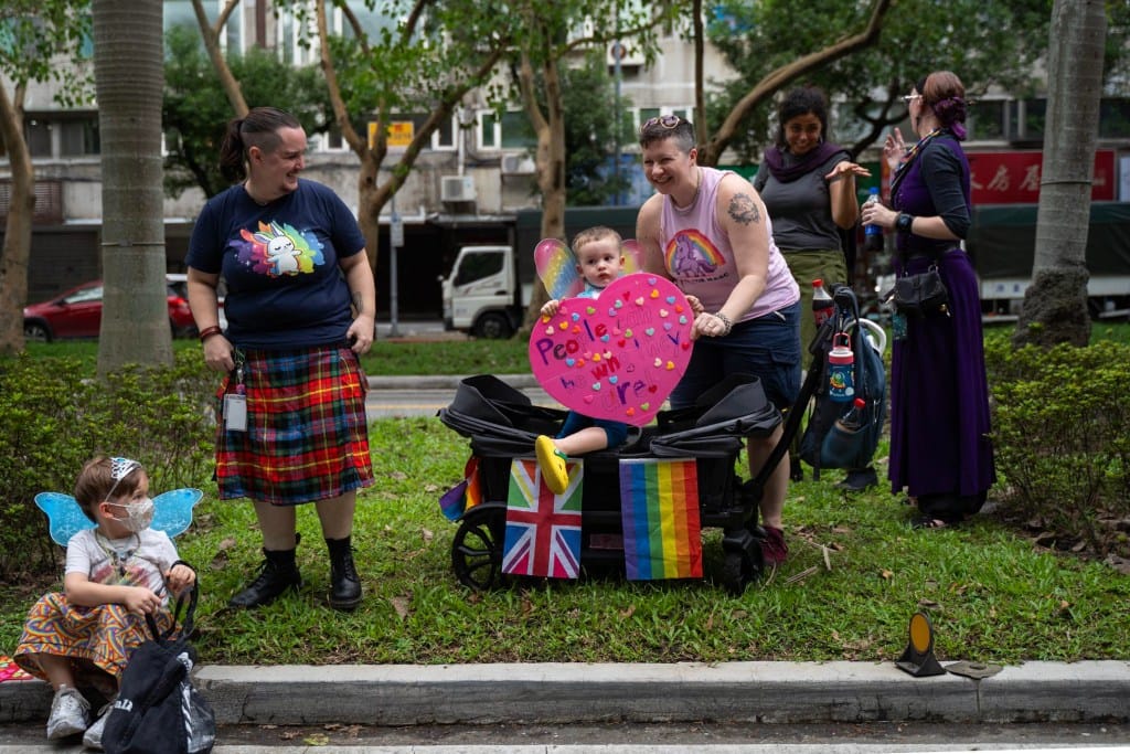 遊行回程路上,Dana 和美國太太 Sarah 頭戴彩虹絲帶,一人背著穿彩條裙子的女兒,一人手舉「我媽是台灣人,為什麼我是外國人」的標語,兩隻手牽在一起。Dana 說,今年已經是第七還八次走遊行了,每年她們都會舉著標語跟隨隊伍前進,過去吸引的比較多是媒體目光,今年則有不少民眾也會上前聊天。