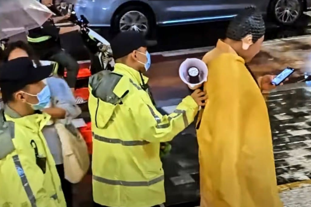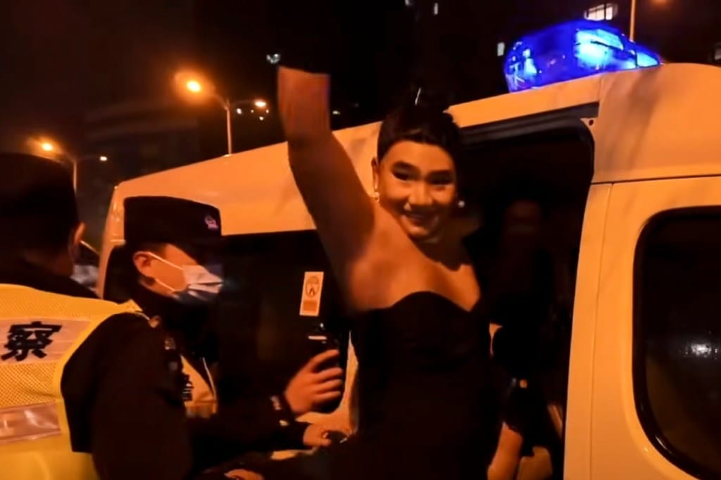 也有游击战的民众遇到警察。 一些自媒体博主称部分万圣变装人士被警察带走。 一则贴在微信视频号上的片段显示:两名警察将一名“如来佛祖”带走,另有两名疑似男扮女装的民众被警察带上一辆警车,上车前还不忘和在场围观的民众挥手。