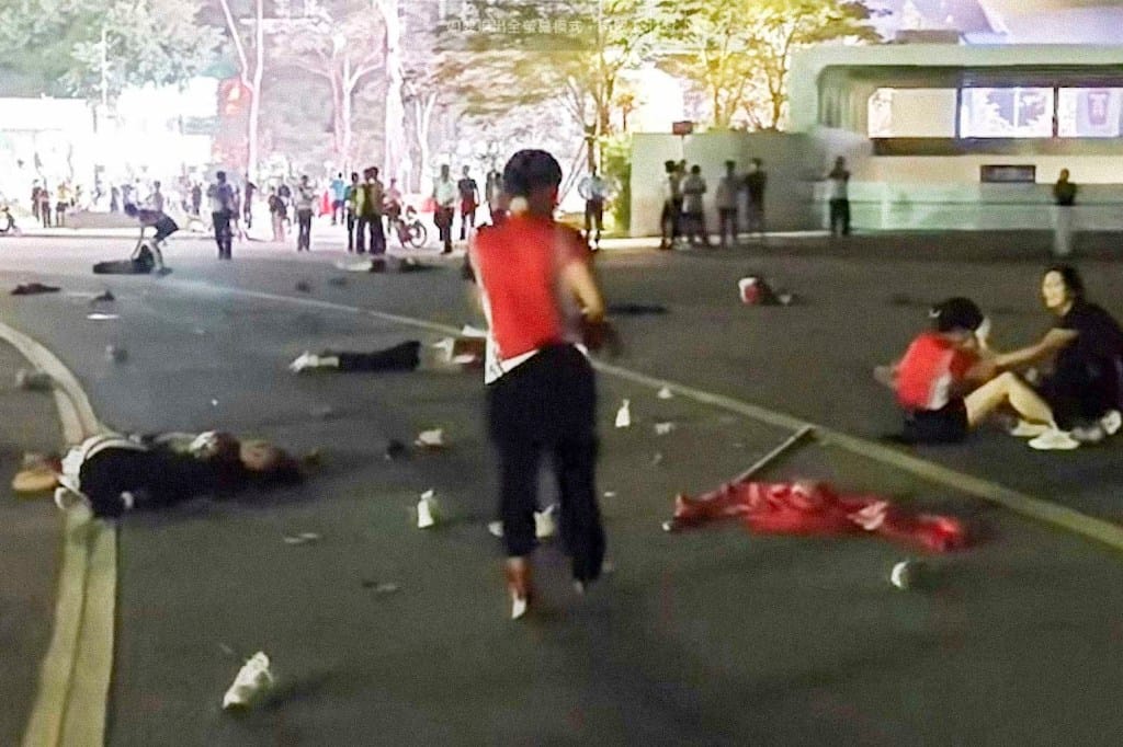 網絡流傳的多個視頻顯示,這台越野車行駛在跑道上,撞倒一群人後,經過一個拐彎處又加速衝向另一波人群。人們驚慌四散,視頻中有人不停地問,「是不是故意(撞人)的?」跑道和旁邊的草坪、空地上,躺着被撞傷的市民,其中尤為醒目的是統一着裝的健步團,至少有三支身着不同顏色隊服的健步隊伍被衝撞。一名倖免的健步團成員回憶,當晚廣場上有五六支健步隊伍,每隊從十幾人到六十人不等。有的健步隊伍很長,除了統一着裝的隊員,還有一些沒穿隊服的其他市民跟在隊伍後邊。