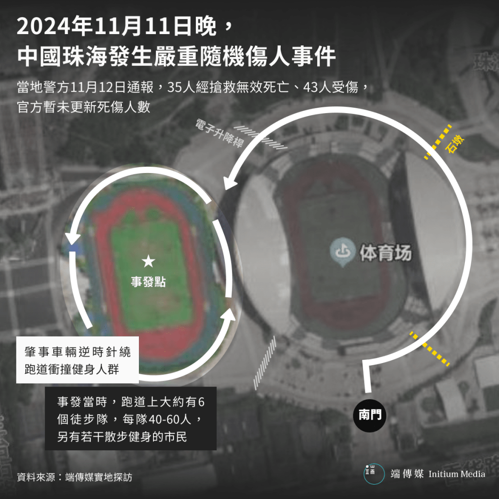 【編者按】2024年中國發生至少10宗無差別隨機傷人事件。11月11日晚,廣東珠海市發生一起嚴重傷人事件,一輛越野車在珠海市體育中心隨機撞人,根據警方11月12日通報,造成35人死亡、43人因傷留院。端傳媒推出「珠海撞人事件」系列,此前已刊登一篇Whatsnew《珠海撞人事件致35人死,中國年內多宗惡性傷人事件引擔憂|Whatsnew》。端傳媒還將推出現場深度報導和相關評論,敬請讀者關注。