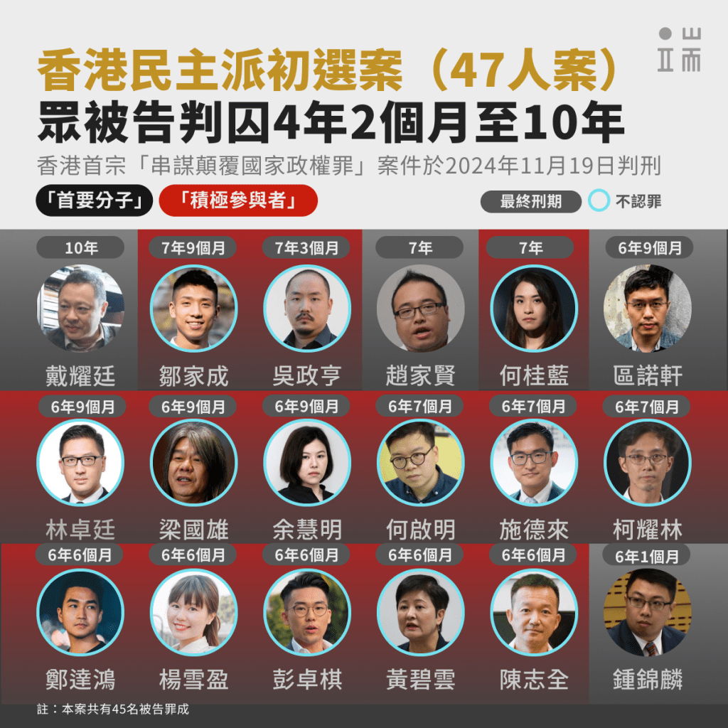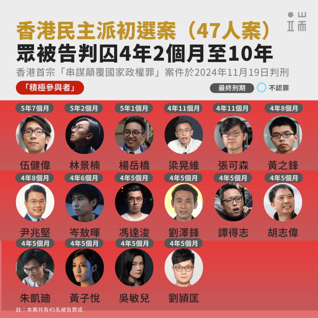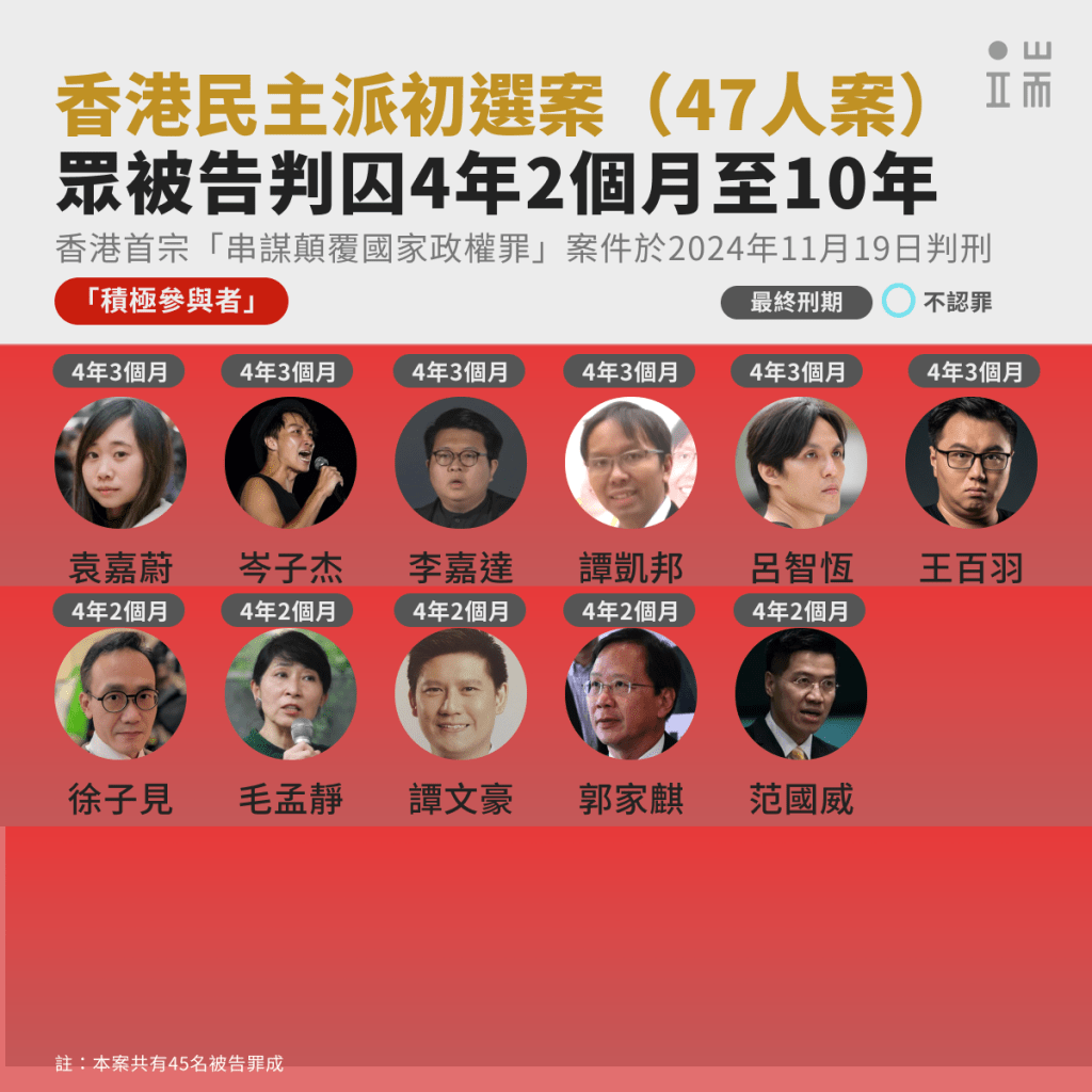 《國安法》最大案、民主派初選47人案中,45名罪成被告今日(11月19日)上午10時於暫代高院原訟庭的西九龍裁判法院判刑。從2021年1月6日被告被抓捕、首次提堂至今,案件已處理接近4年。此為「顛覆國家政權罪」首案。