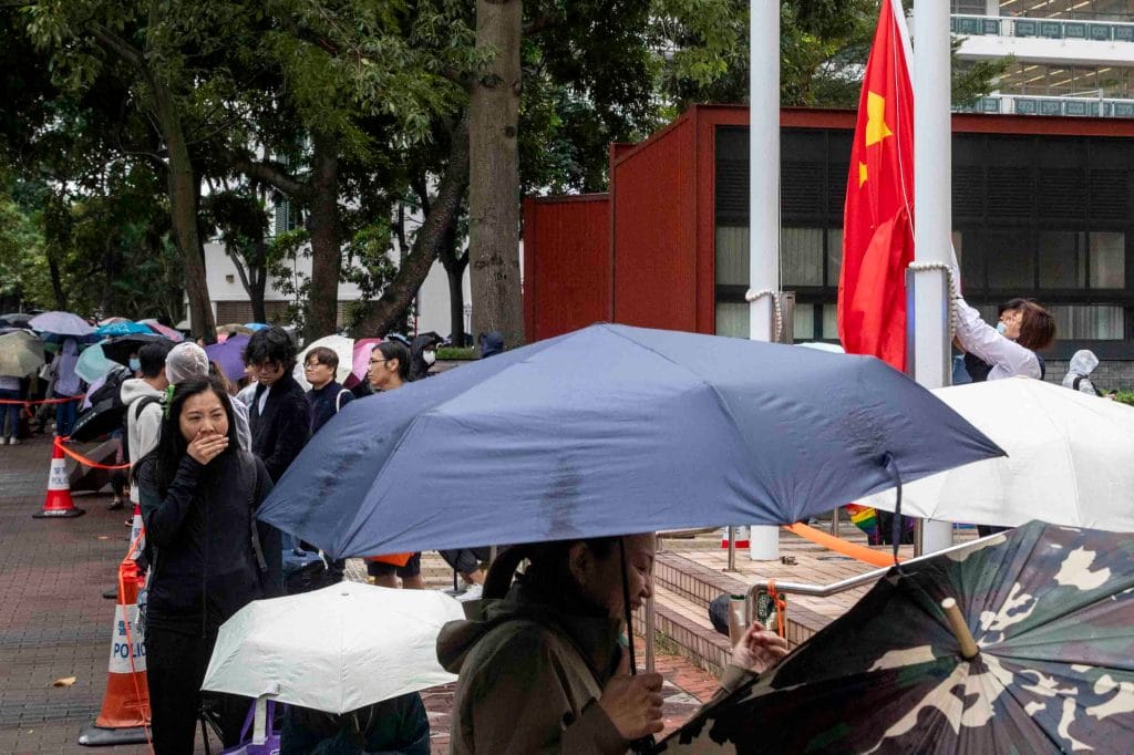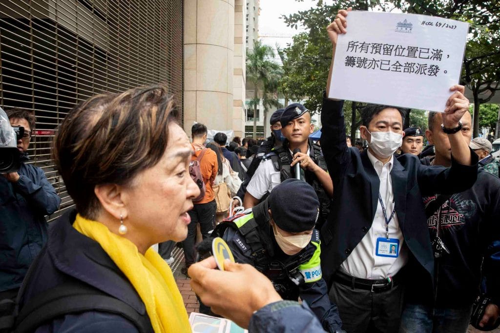开庭前清晨气温骤降,下起大雨,数百名旁听人士穿风衣、撑伞排队,长长人龙从法庭外延伸,不少人从前一夜开始轮候旁听。 警方布防重重,大批警员和警车在庭外及附近一带驻守,亦出动「剑齿虎」装甲车。 警员一度从队中带走曾建成、外号「女长毛」 雷玉莲等社运人士,搜查其随身物品。