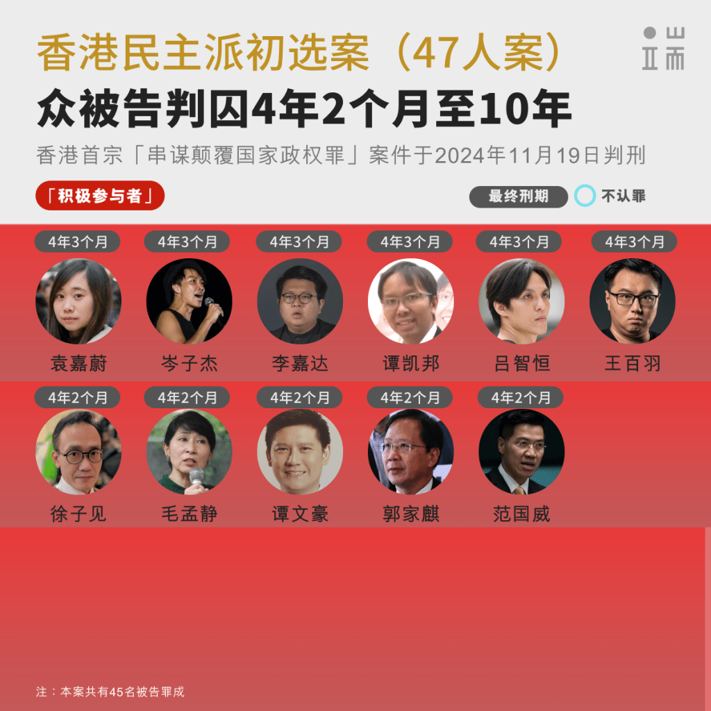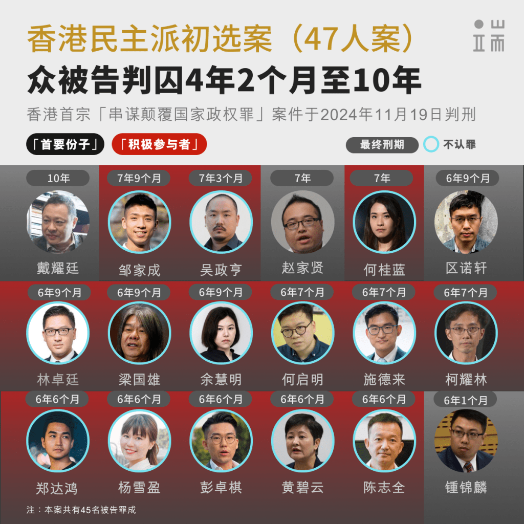 47名被告因组织或参与2020年7月的民主派初选,被控《国安法》“串谋颠覆国家政权罪」”,其中31人认罪、16名不认罪,最终仅两人脱罪。 他们为香港公民社会中不同政治光谱的政治人物,包括活跃政坛多年的泛民主派、呼声渐高的本土派、社运或工运领袖、政治素人;也包括法律学者、记者及商人等。