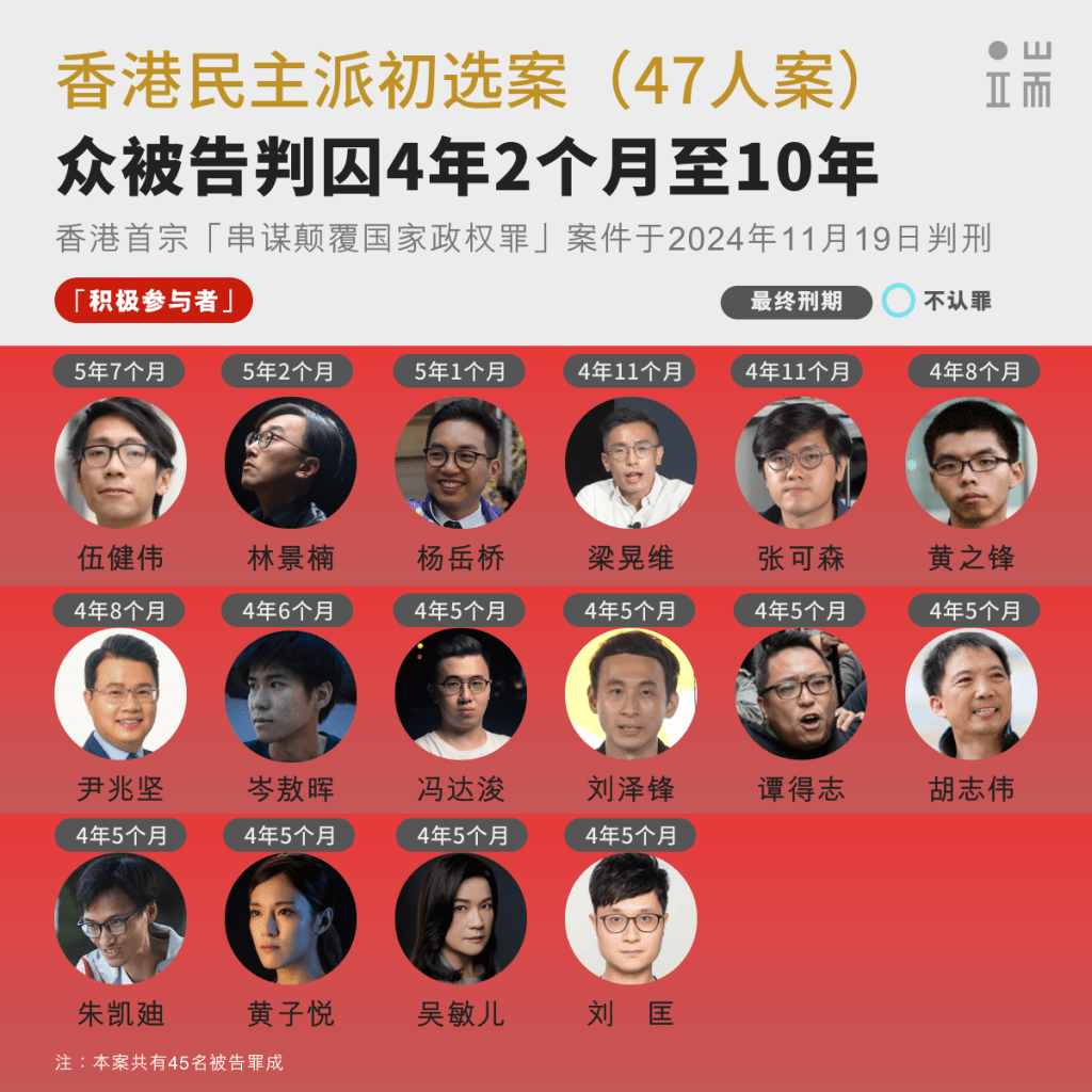 其余人士被视为“积极参与者”,判囚4年2个月至7年9个月不等。 其中认罪被告的刑期在4年2个月到5年7个月不等,不认罪被告在6年6个月到7年9个月不等。