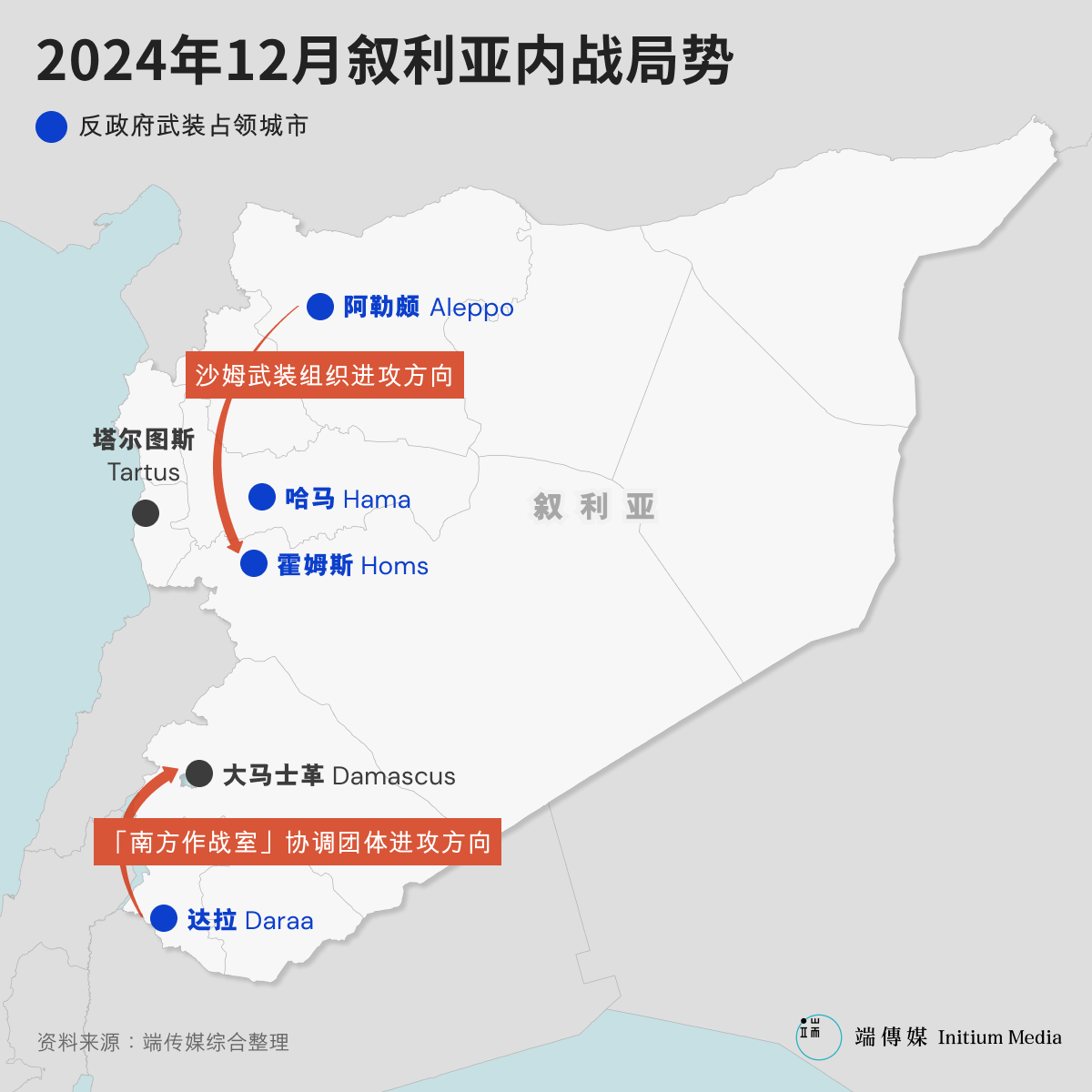 在攻下阿勒颇后,沙姆解放组织为首的北部反对派武装加快了沿著西部公路干道向南行军的速度。仅仅过去一周,他们就在12日5日占领了位于阿勒颇到首都大马士革中间的叙利亚第四大城市哈马(Hama),进而继续向南据称占领了叙利亚第三大城市霍姆斯。