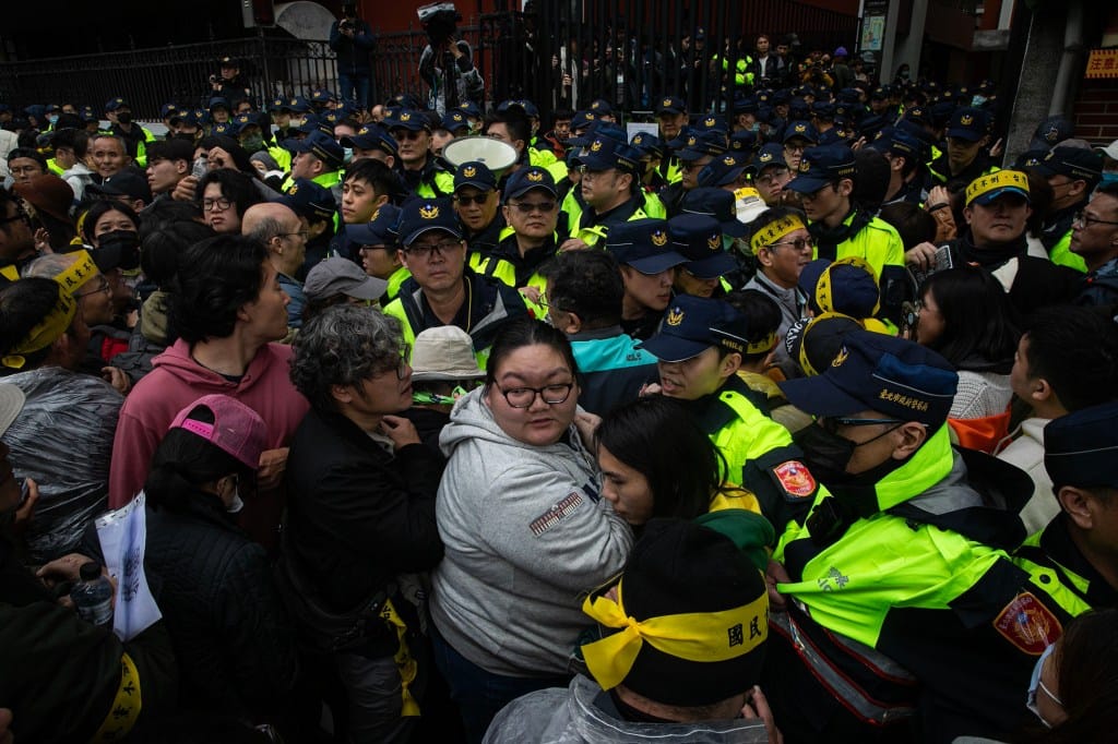 即便今晨冷气团来袭,寒风阴雨绵绵,不少民众仍到场高喊“我要民主、退回恶法”。随着上午民进党多名立委被拉下主席台,场外示威群众一度群情激动,推倒立法院位于济南路一段的出入口围栏,与现场警方爆发肢体推挤,双方约莫推挤达40分钟,直到绿委出面劝说才缓和冲突。警方后于中午12时20分左右关闭接近该出入口。