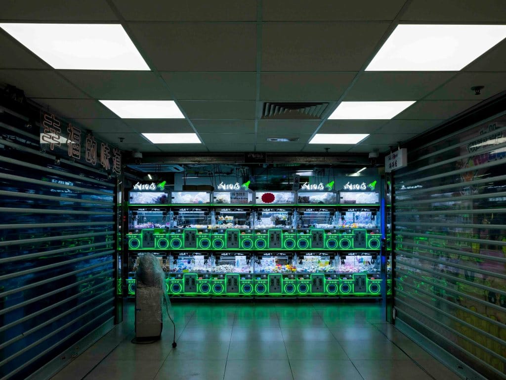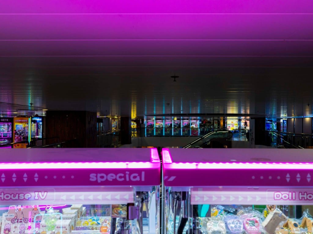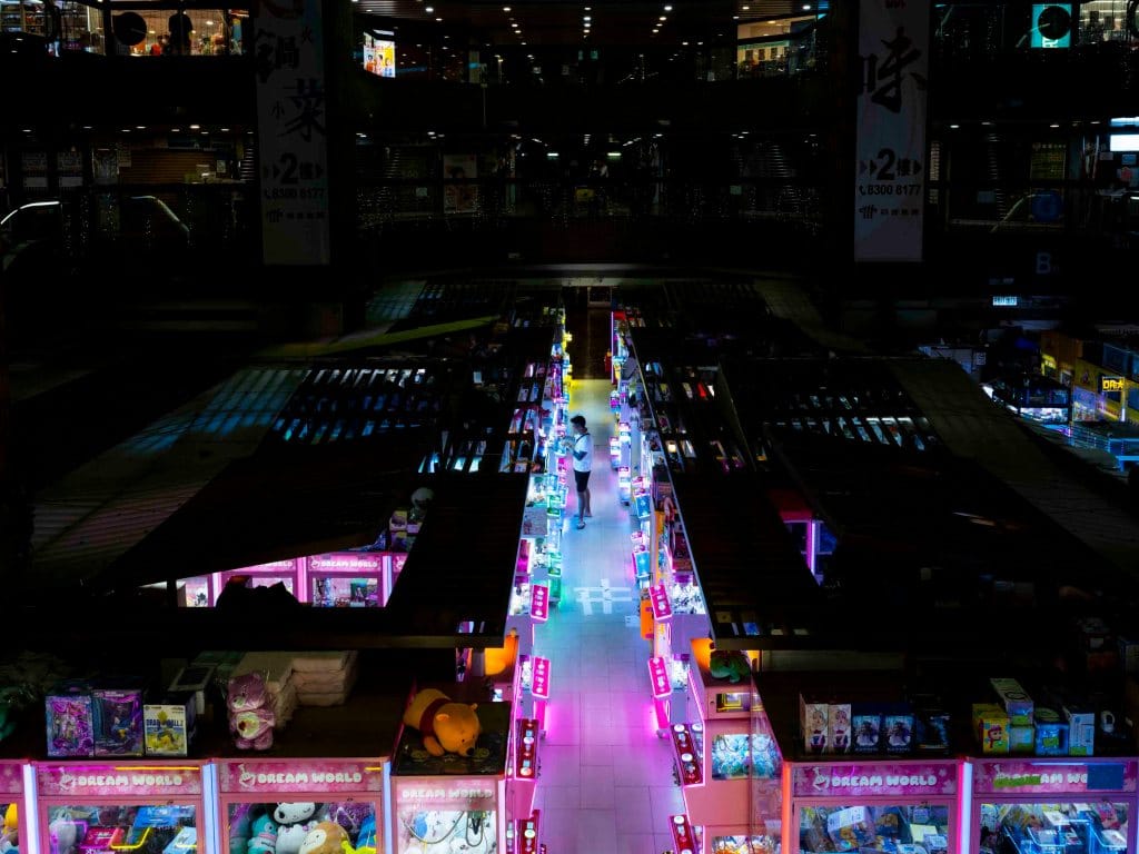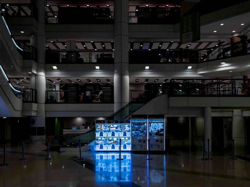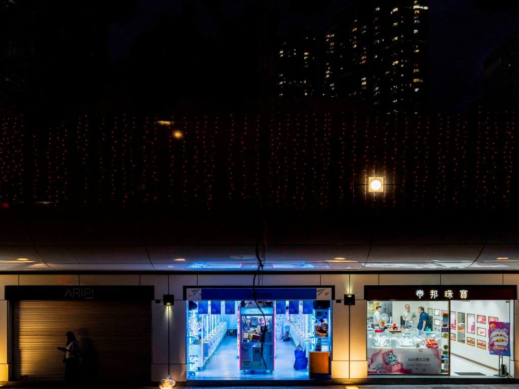 2024年10月18日,沙田京瑞廣場。攝:林振東/端傳媒當老牌和連鎖店離場,又遇上業主寧願低價換來希望也不想丟空舖位,願意短期承租的夾公仔店和散貨型商舖,正好在租金回落的市場裡逆市翻生。在香港開一間夾公仔店,聘請人手少、也不用領取臨時娛樂場所牌照。無須過多的長遠計劃,也用不上耐用的裝潢設計,只要七彩燈箱著燈、或鬆或緊的夾爪準備好,一場新的遊戲回合就在透明箱裡啟動、倒數計時。