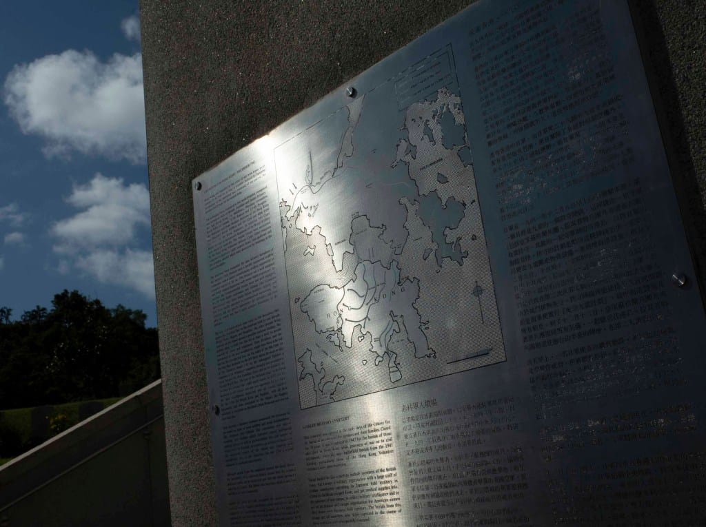 2024年7月,赤柱军人坟场,正门展示了香港保卫战上盟军建立的防线位置及日军攻打香港岛的路线。摄影:陈碎念