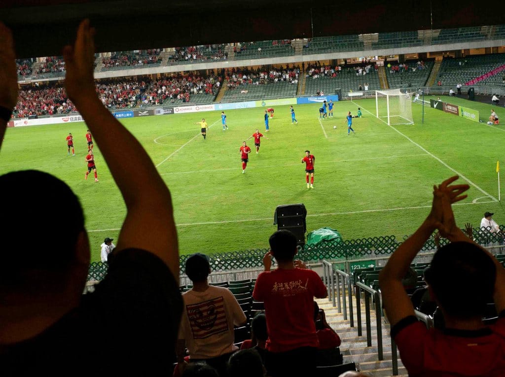 2024年11月,香港大球场,香港队球员于入球后与球迷庆祝。摄影:陈碎念