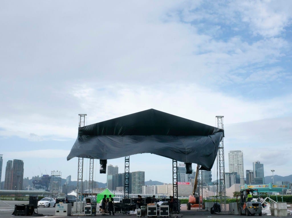 2024年9月,中环海滨,工作人员正搭建一个表演舞台。摄影:陈碎念