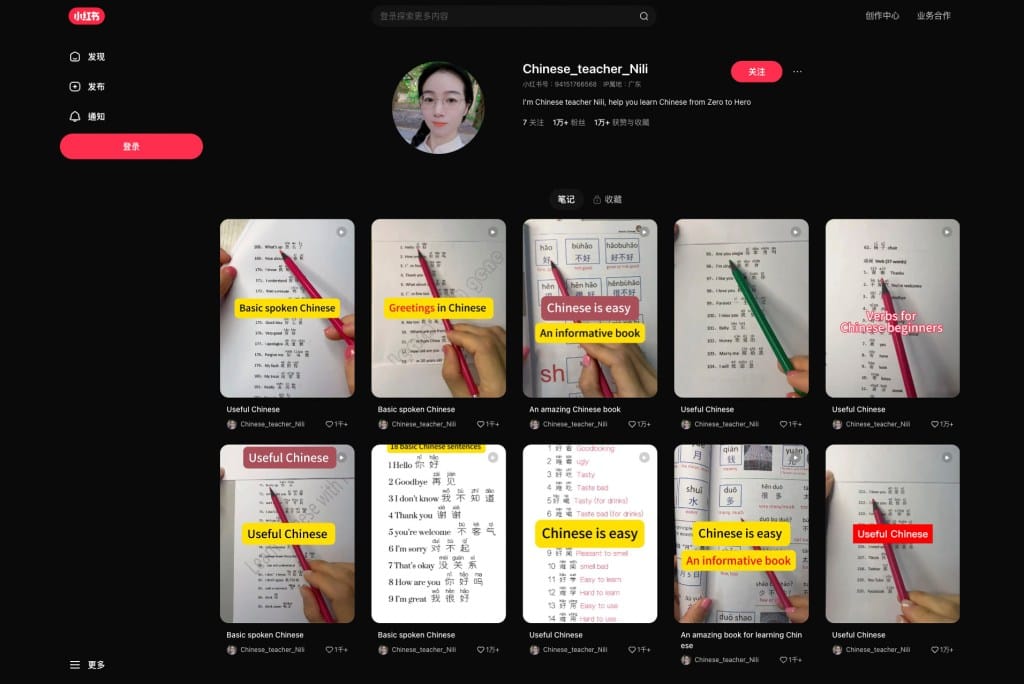 此外,中文學習賽道也成為主流。大部分新用戶不知道如何設置及隱藏小紅書上的「收藏功能」,在他們的收藏夾裏,很多人收藏的第一條視頻即是「Useful Chinese」(實用中文)、「Verbs for Chinese Beginners」(給中文初學者的詞彙)。一位博主最新發布的兩條基礎中文教學視頻下,已經擠滿IP地址為美國的用戶。視頻點贊量也從原來幾百至幾千的量級飛躍為上萬。