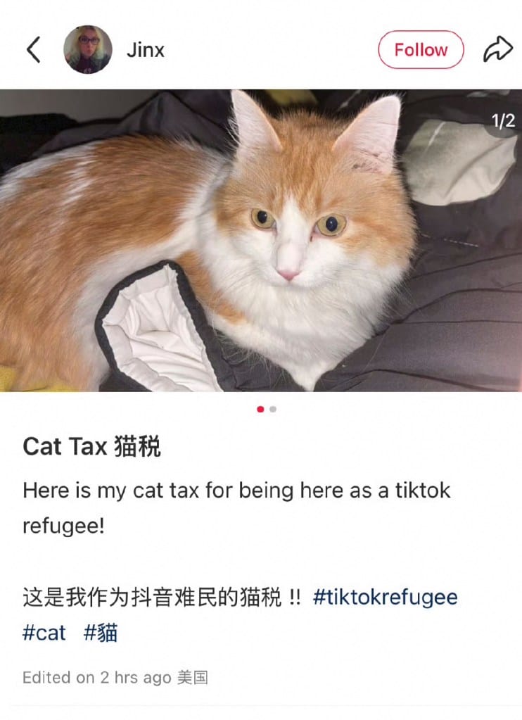 洋抖難民們也很快發現了獲得高讚的訣竅,即發布貓咪照片,網友稱之為「Cat Tax(貓咪稅)」。貓咪照片作為自我介紹封面,出現在難民們聚集的評論區裏。小紅書帶圖評論的功能讓交貓稅變得很簡單。哪怕帖子主題和貓咪無關,洋抖難民們都能通過發布貓咪圖片獲得上千點贊。
