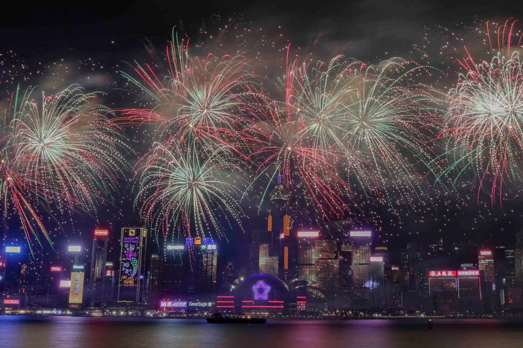 年初二晚的烟花汇演共分成九幕,历时23分钟,合共发放23888枚烟花,整体耗资约千万港元。“8”字和金元宝图案在上空炸开,而第八幕的《添福添喜》亦以大熊猫为主题,呈现六个熊猫头,代表中央政府去年赠港的“安安”和“可可”、居港多年的“盈盈”和“乐乐”,以及新生熊猫龙凤胎。