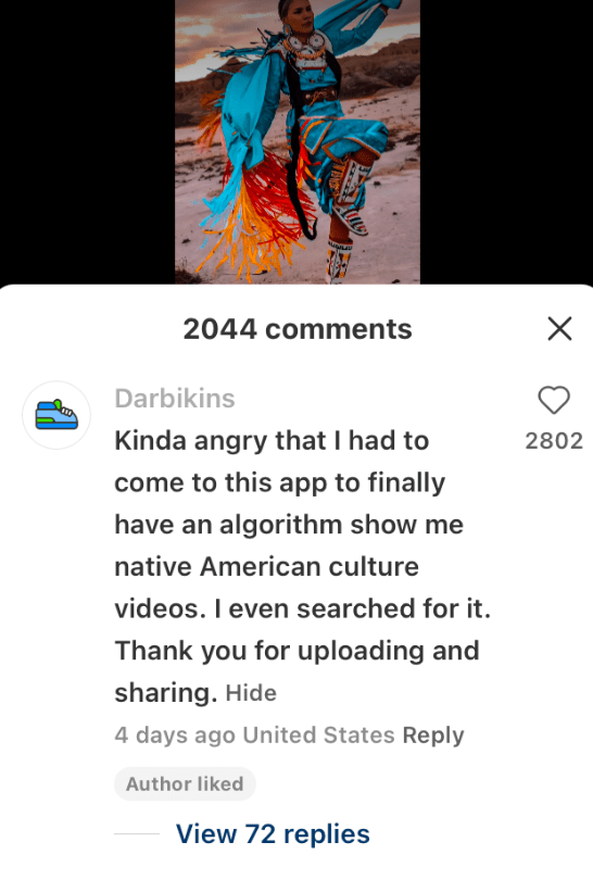 對原住民用戶來講,找到社群的喜悅不僅來自於大洋對岸的熱情和好奇,還來源於小紅書的算法 ——不少同處於美國的洋抖難民,也表示自己第一次在社交媒體上刷到這麼多的原住民內容,而且還是國外的社交媒體。只要發現了一條原住民內容互動,美洲原住民的內容就源源不斷地從自己主頁的發現欄裏跳出來,讓從TikTok來的許多用戶頗為吃驚。因為原住民群體在美國被邊緣化的歷史處境,一些原住民認為Instagram等西方社交軟件涉嫌壓制原住民內容。