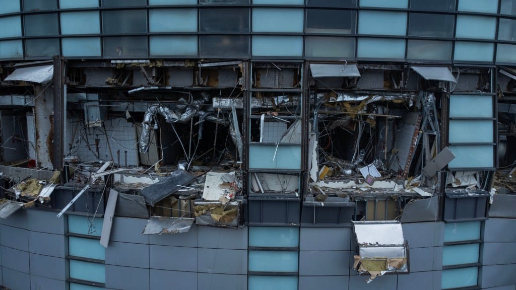 事发后,百货公司10至11楼因管线爆裂漏水,建筑内部也传出水管爆裂声响不断,现场持续有大量浓烟窜出,室内受损严重,电梯严重毁损扭曲变形,无法使用,楼梯间多处墙面剥落,内部天花板也出现大面积塌陷。